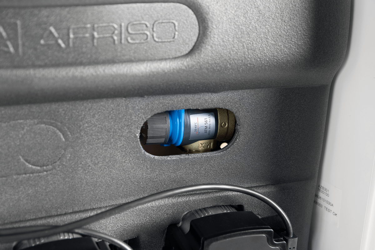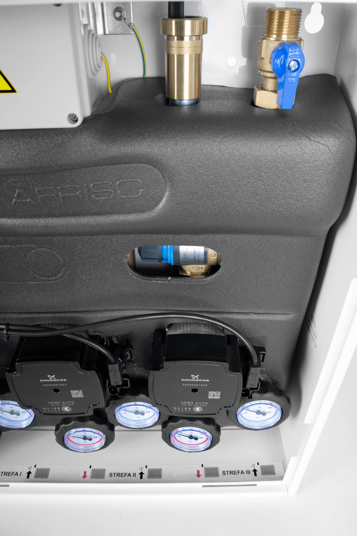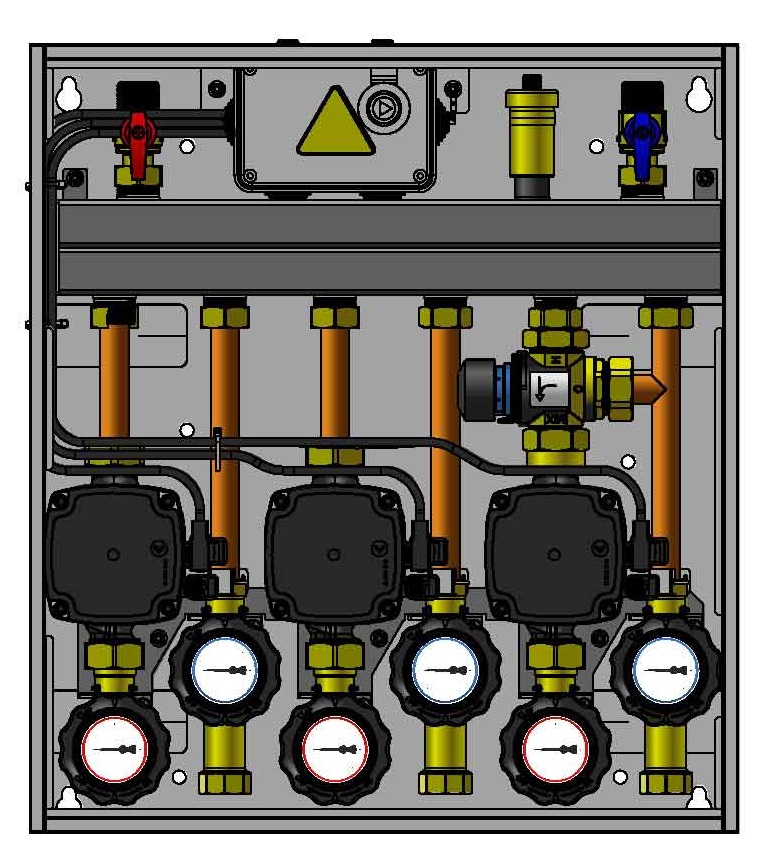 Wyposażony w pompy Grundfos UPm³ i termostatyczny zawór mieszający ATM 561 z regulacją 20 ÷ 43°C. Zakres dobrany na podstawie optymalnych temperatur zasilania instalacji ogrzewania podłogowego.