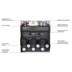 Wyposażony w pompy Grundfos UPm³ i termostatyczne zawory mieszające ATM 561 z regulacją 20 ÷ 43°C. Zakres dobrany na podstawie optymalnych temperatur zasilania instalacji ogrzewania podłogowego.