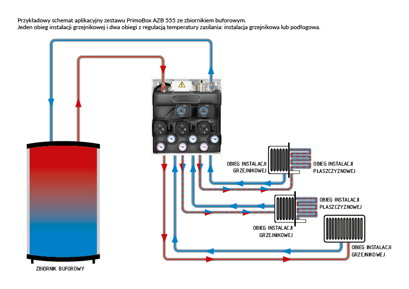 Tworzy 3 obiegi grzewcze w oparciu o wbudowany rozdzielacz.