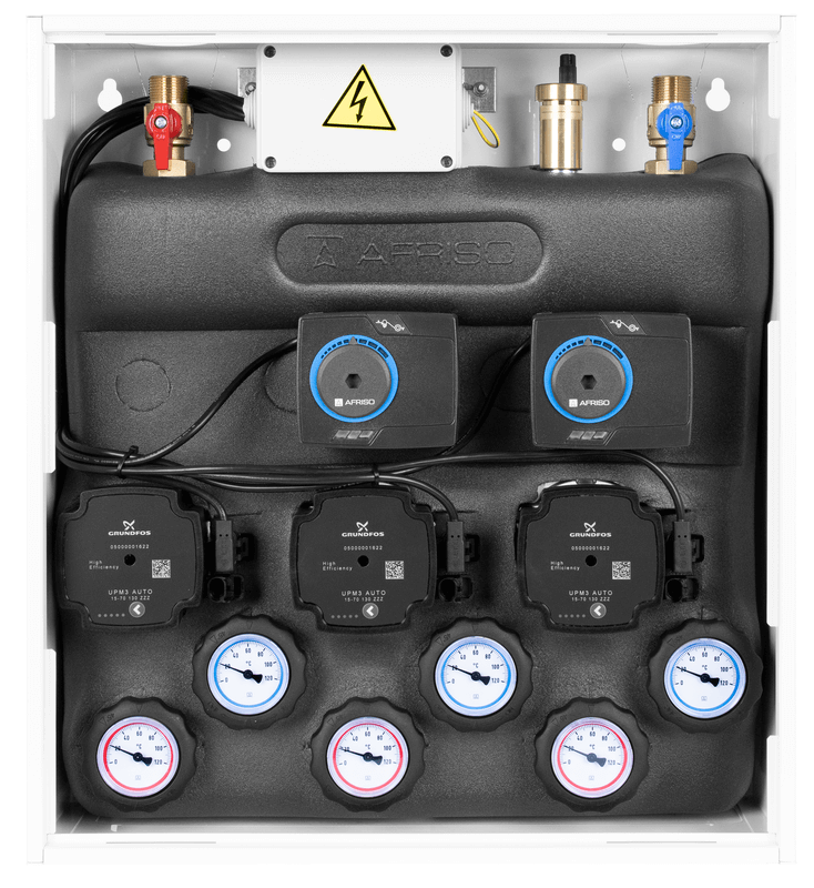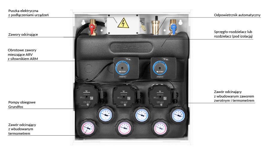 Wyposażony w pompy Grundfos UPm³ oraz zawory obrotowe z siłownikami ARM 141.
