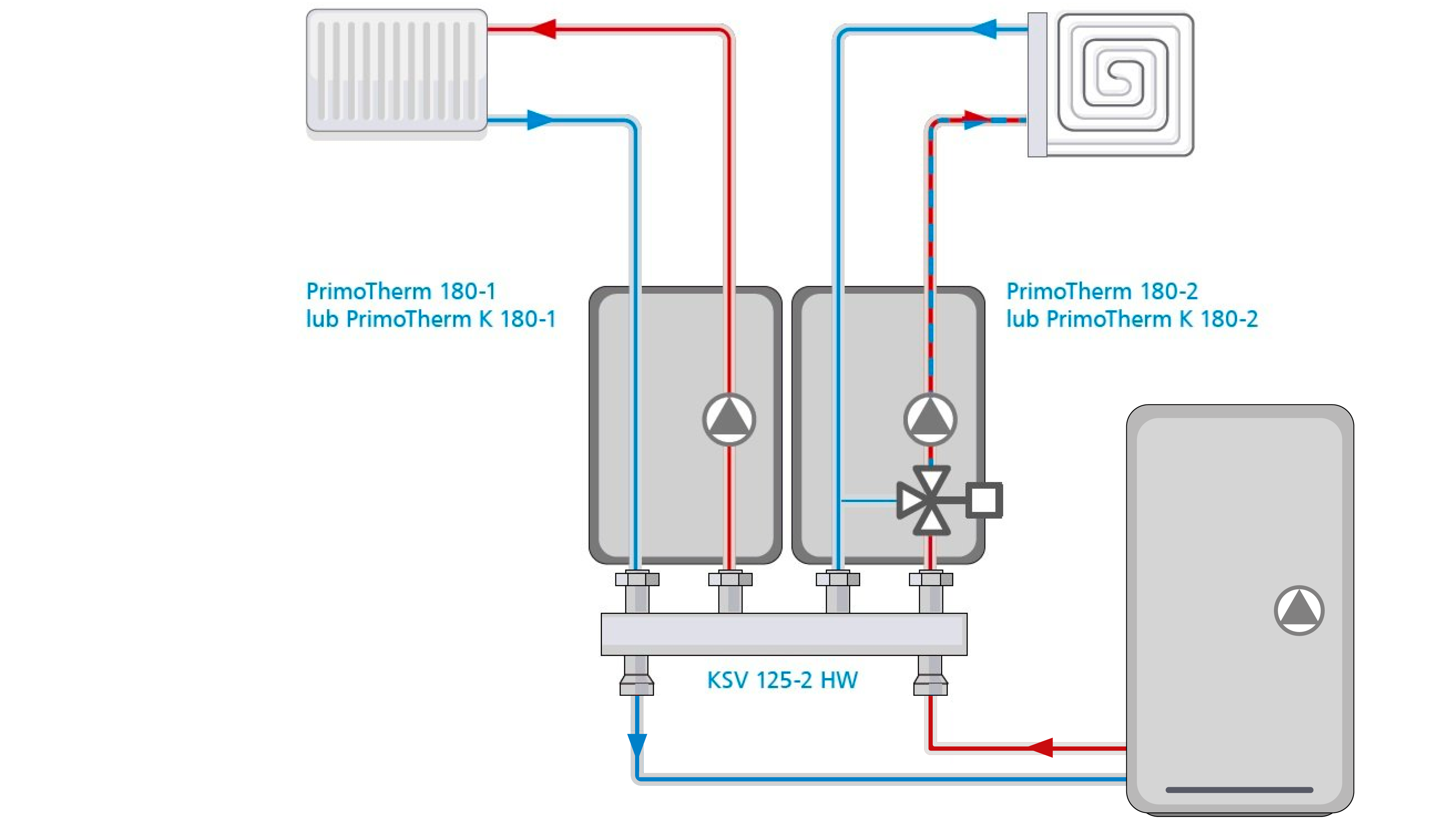 - Stosowana w instalacjach grzewczych i chłodzących.- Montowana na ścianie między źródłem ciepła/ chłodu a instalacją odbiorczą.