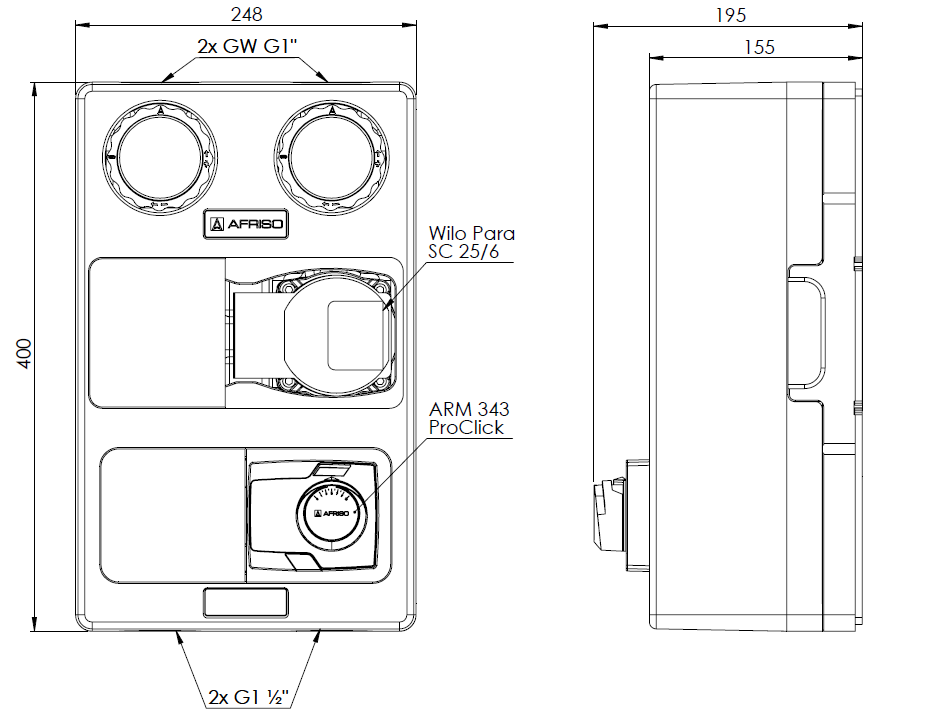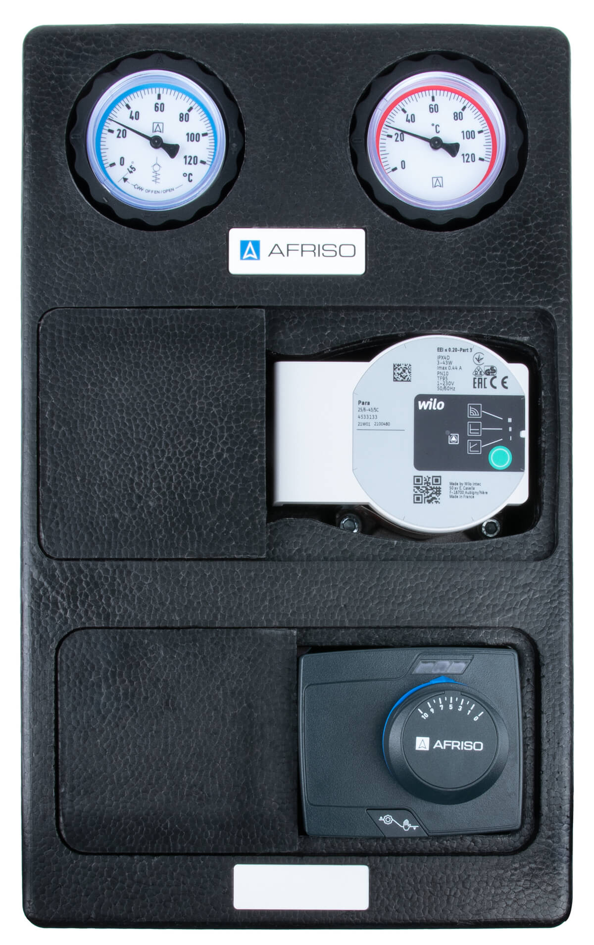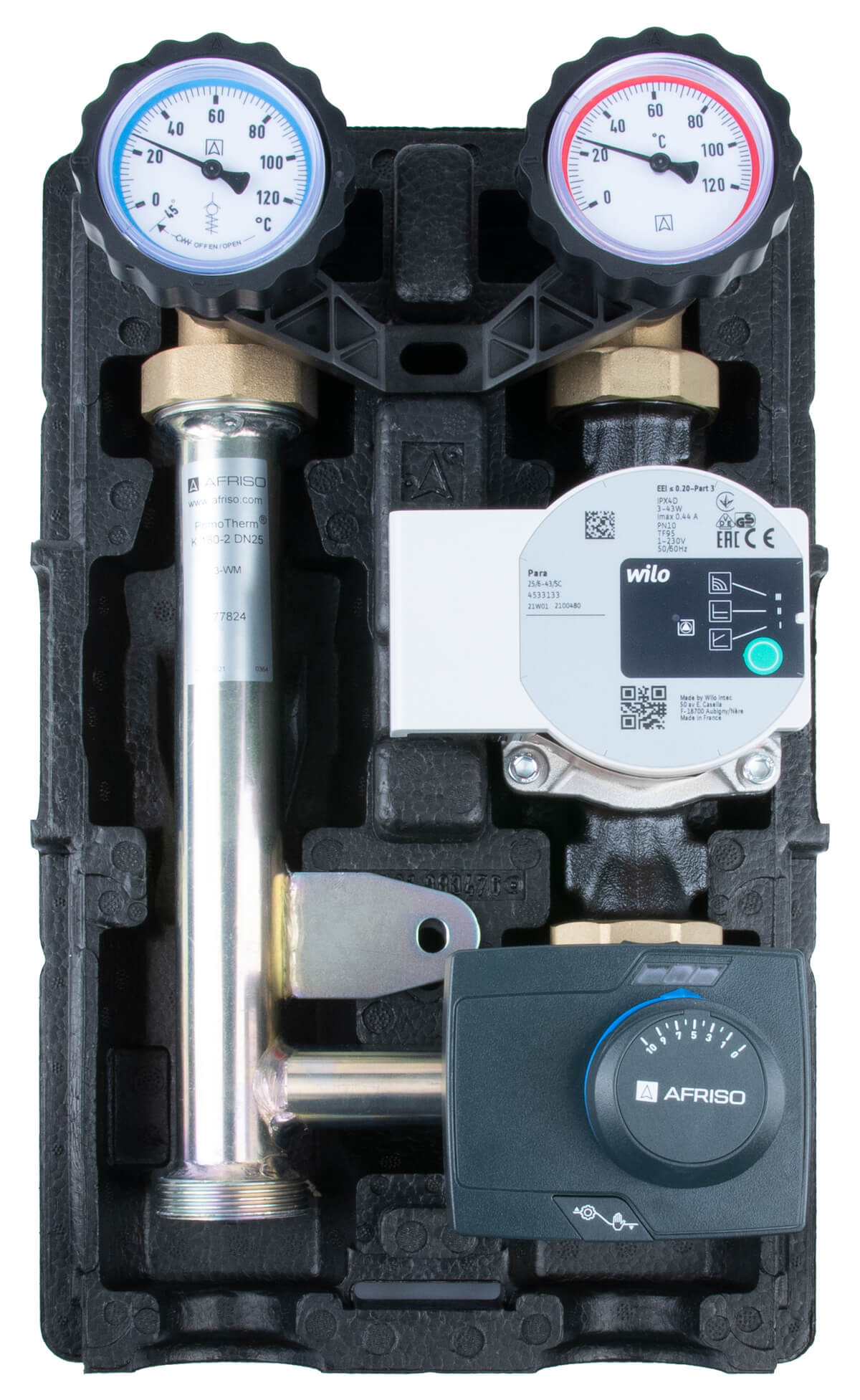 Grupa pompowa AFRISO PrimoTherm K 180-2 DN 25 WP 3-WM-SM GZ x GW 1 1/2'' x 1'', z zaworem mieszającym, z izolacją, z pompą obiegową Wilo Para SC 25/6, z siłownikiem arm 343 proclick