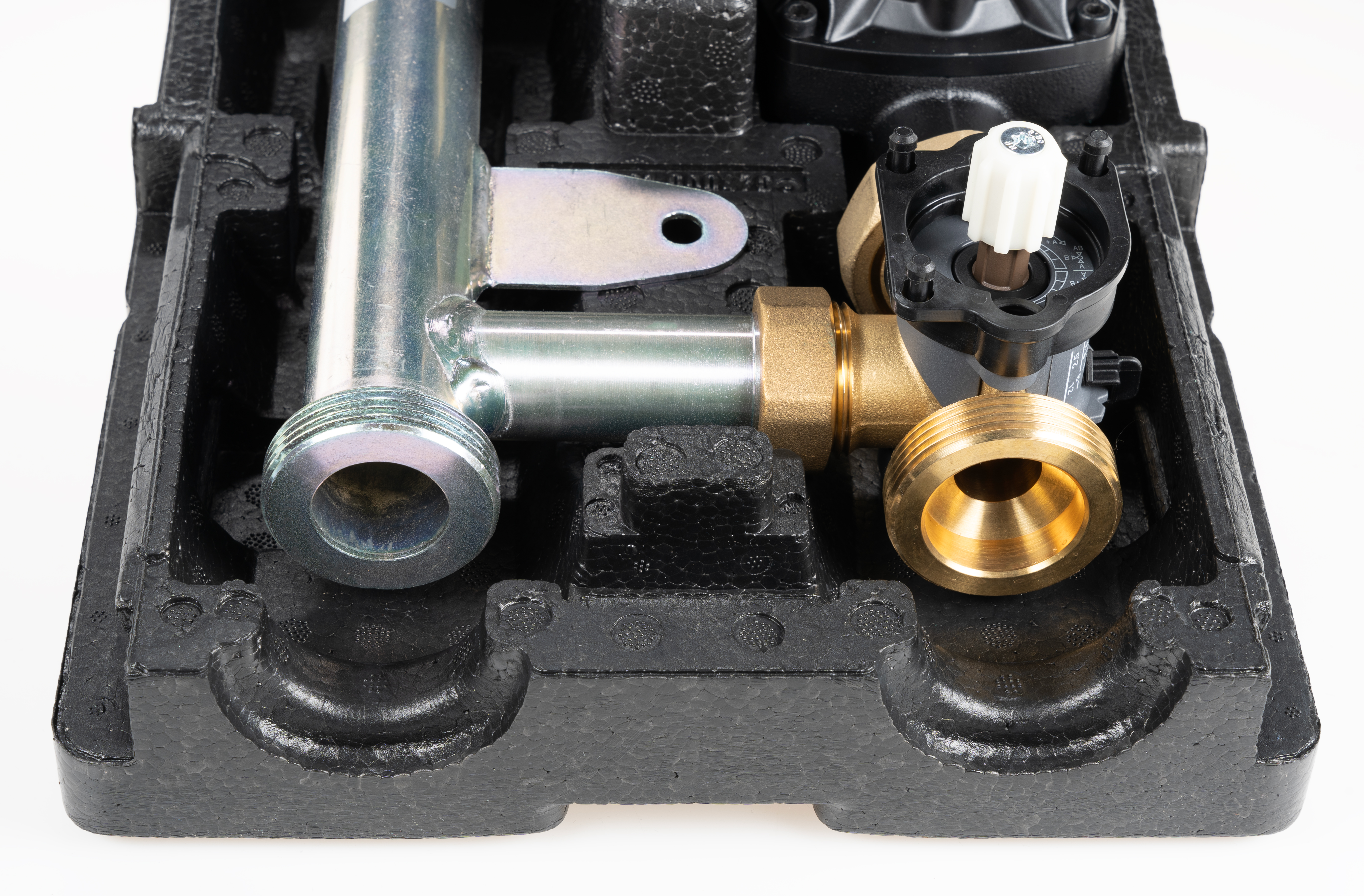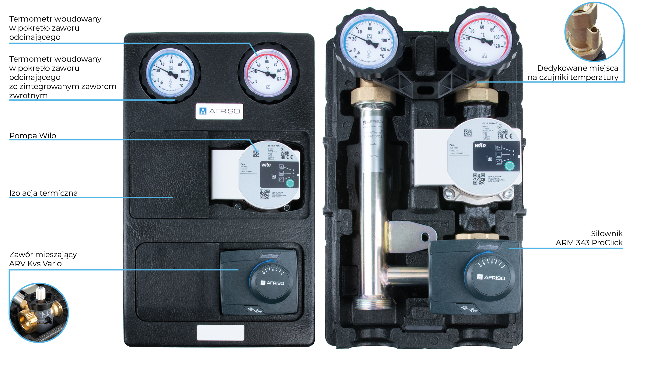Zainstalowany zawór mieszający ARV Kvs Vario z możliwością ustawienia Kvs w zakresie 2,5÷12 m³/h, pompa Wilo Para SC 25/6 oraz siłownik ARM 343 ProClick (3-pkt., 230 V, 120 s).