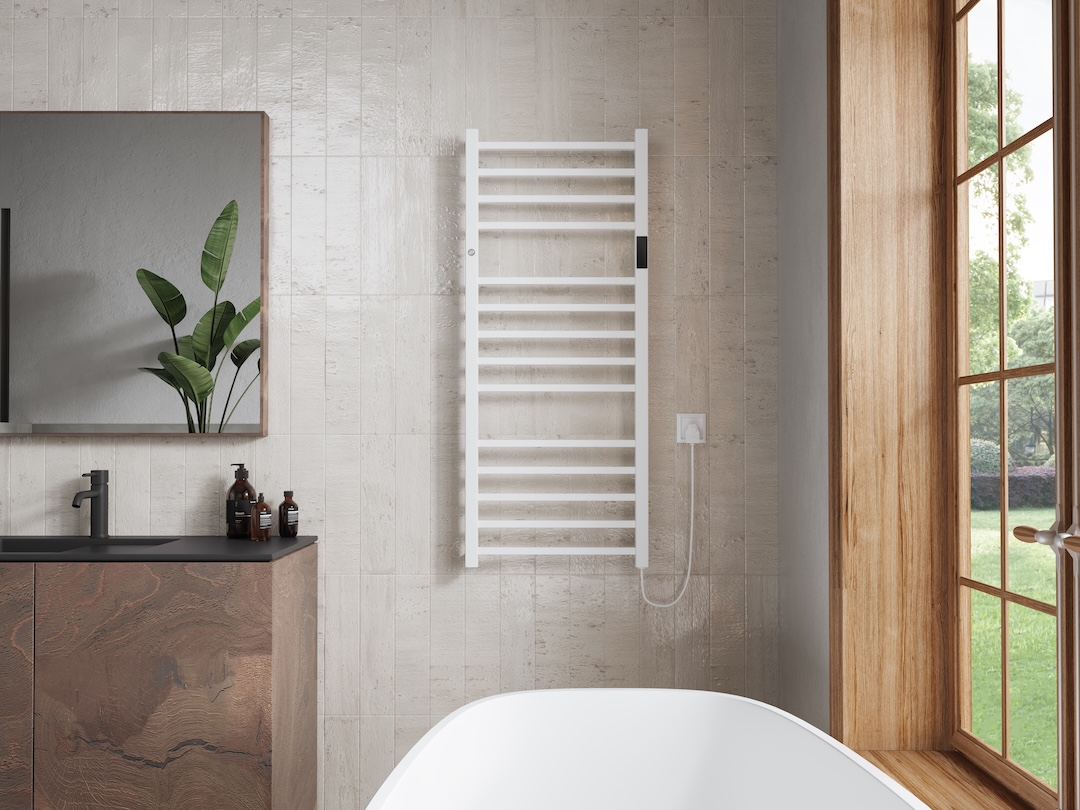 Grzejnik doskonale sprawdza się w łazienkach, również tych z ogrzewaniem podłogowym – umożliwia szybkie suszenie ręczników i tkanin. Intuicyjny panel dotykowy oraz sterowanie aplikacją zapewniają wygodę użytkowania każdego dnia.