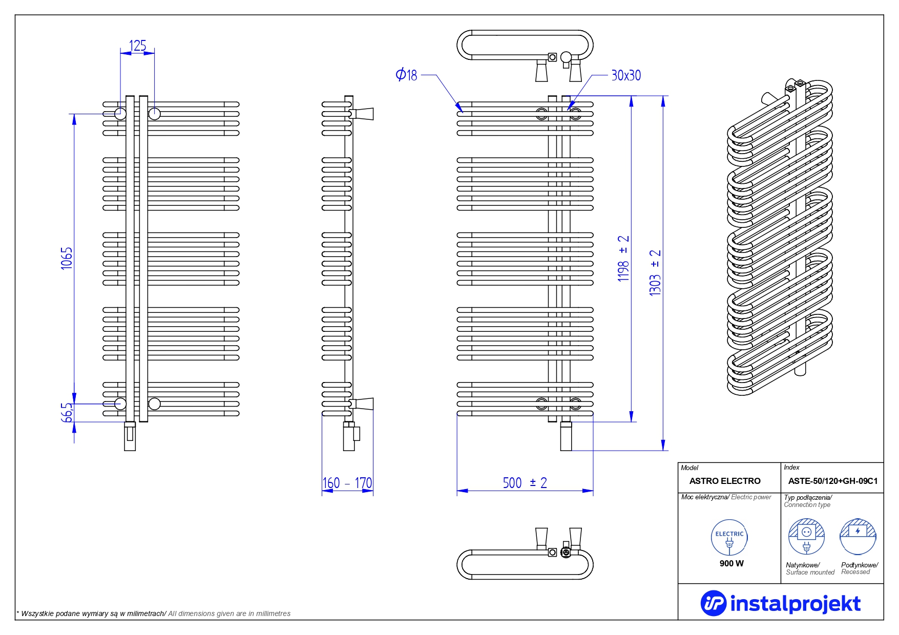 Grzejnik elektryczny (suszarka) INSTAL-PROJEKT ASTRO ELECTRO, wym. 1198 (1303 z grzałką)/500 mm, kolor czarny, moc 900 W