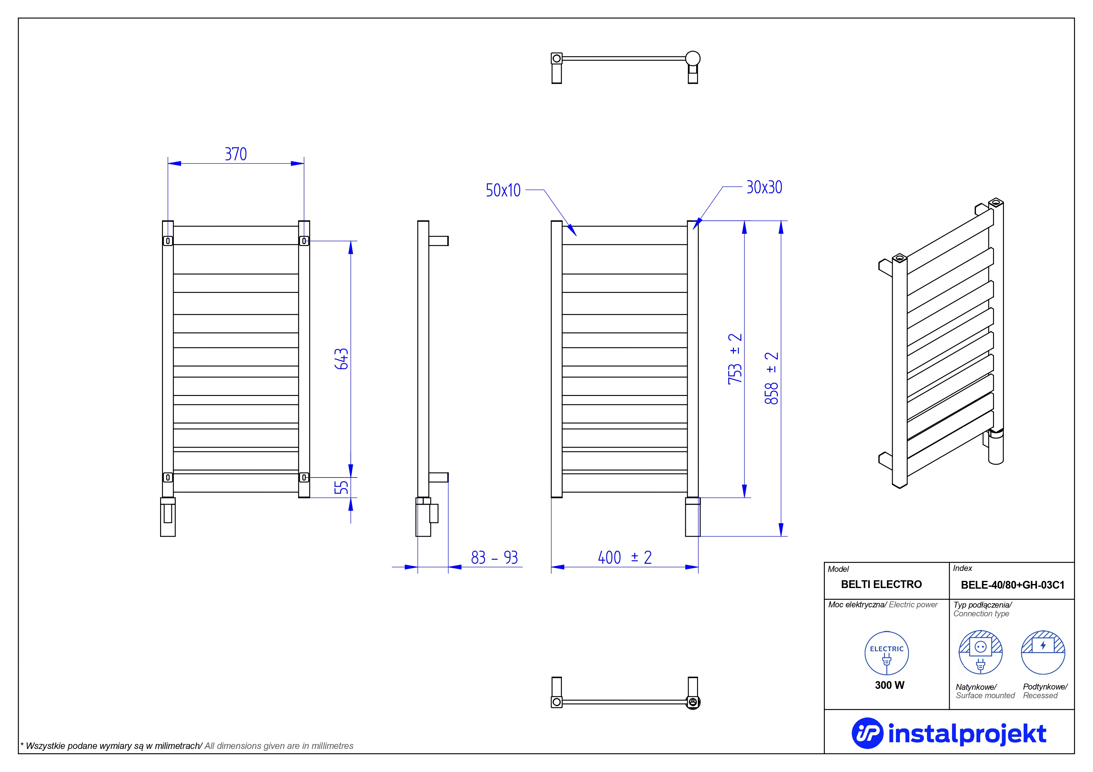 Grzejnik elektryczny (suszarka) INSTAL-PROJEKT BELTI ELECTRO, wym. 753 (858 z grzałką)/400 mm, kolor czarny, moc 300 W