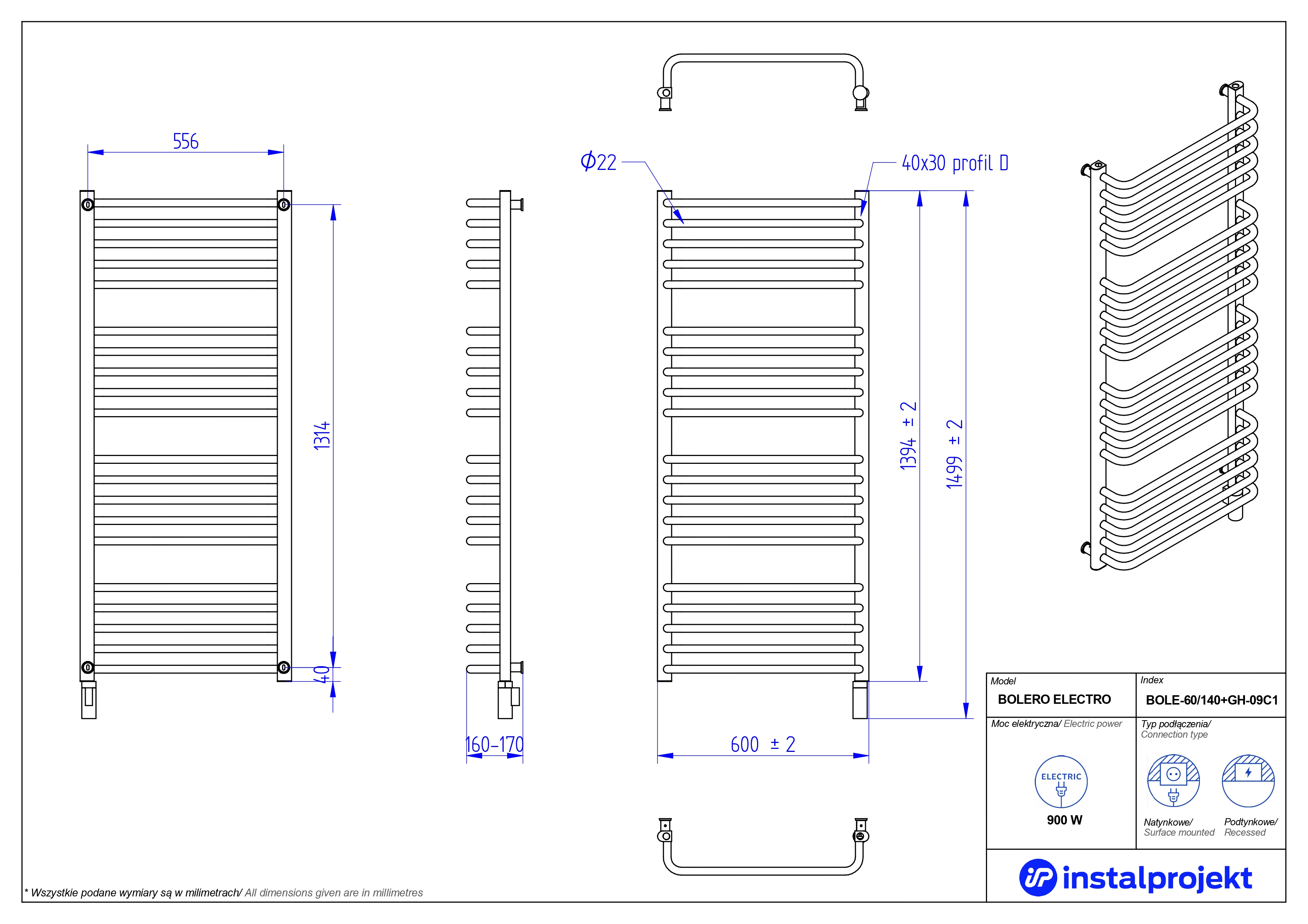 Grzejnik elektryczny (suszarka) INSTAL-PROJEKT BOLERO ELECTRO, wym. 1394 (1499 z grzałką)/600 mm, kolor biały połysk, moc 900 W