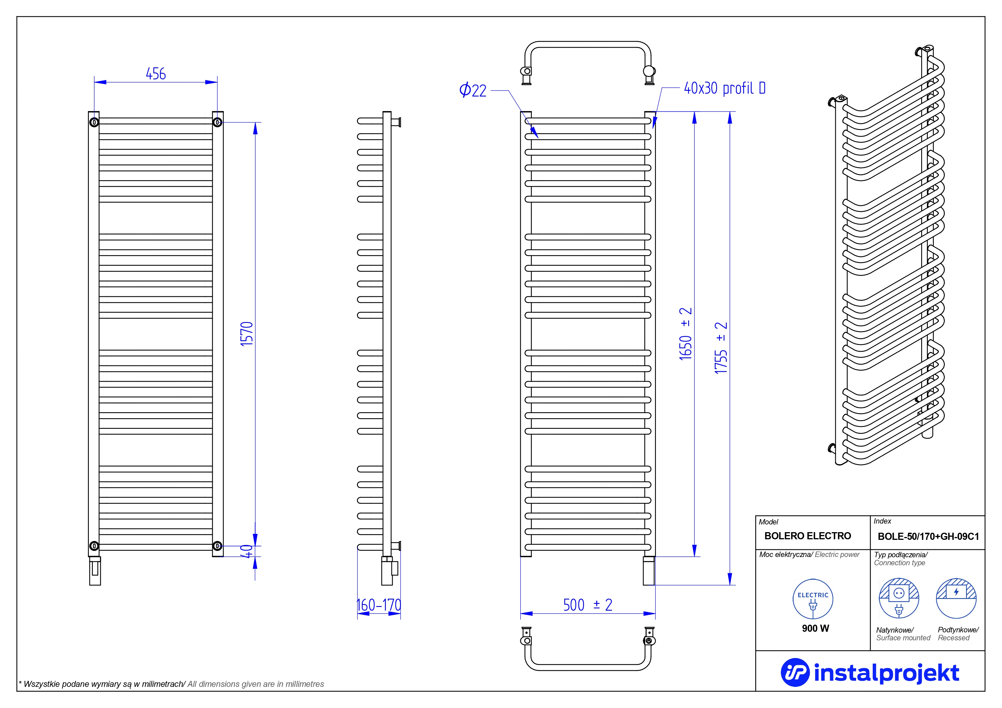Grzejnik elektryczny (suszarka) INSTAL-PROJEKT BOLERO ELECTRO, wym. 1650 (1755 z grzałką)/500 mm, kolor biały połysk, moc 900 W