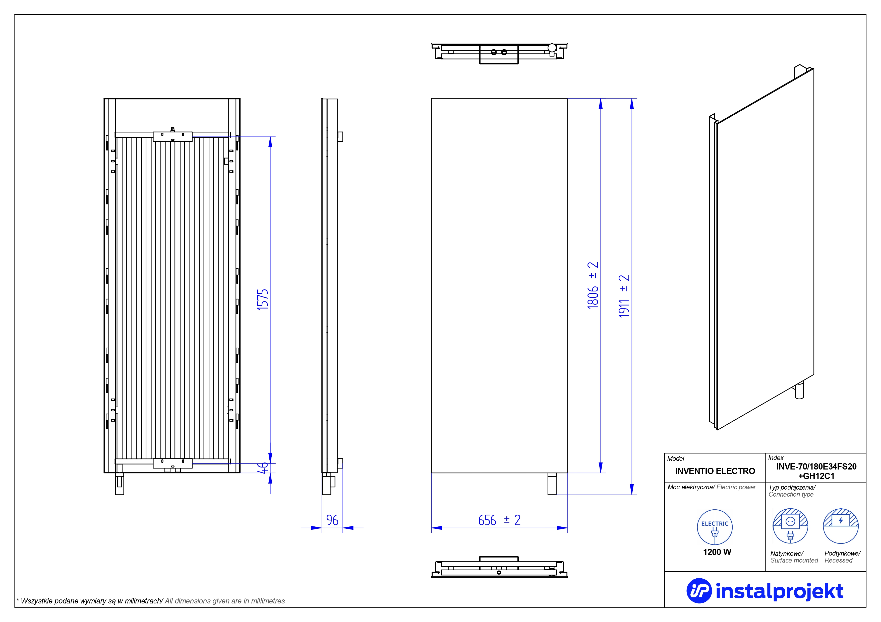 Grzejnik elektryczny (suszarka) INSTAL-PROJEKT INVENTIO ELECTRO, wym. 1806 (1911 z grzałką)/656 mm, moc 1200 W