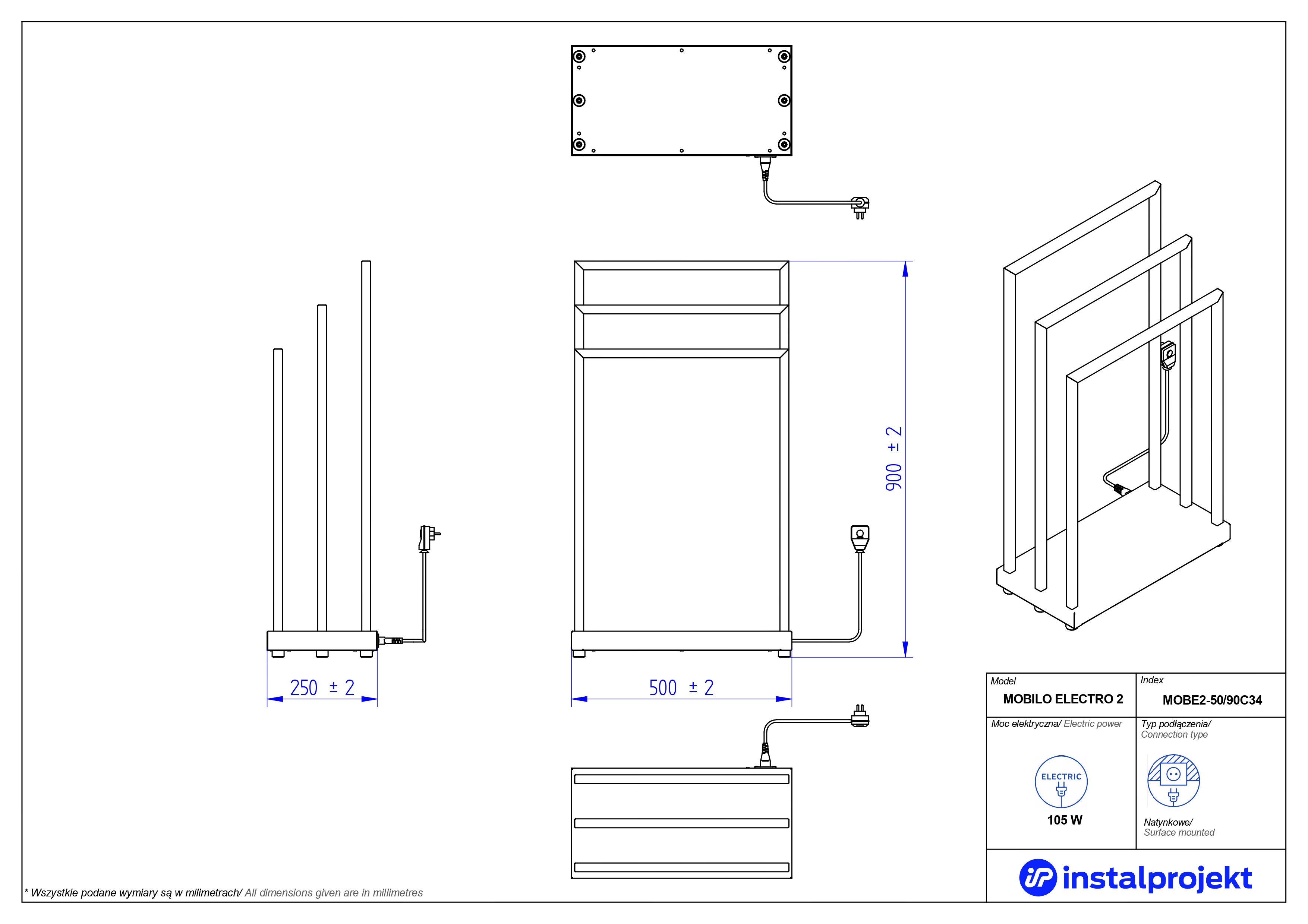 Grzejnik elektryczny (suszarka) INSTAL-PROJEKT MOBILO ELECTRO 2, wym. 900/500 mm, kolor czarny mat, moc 105 W