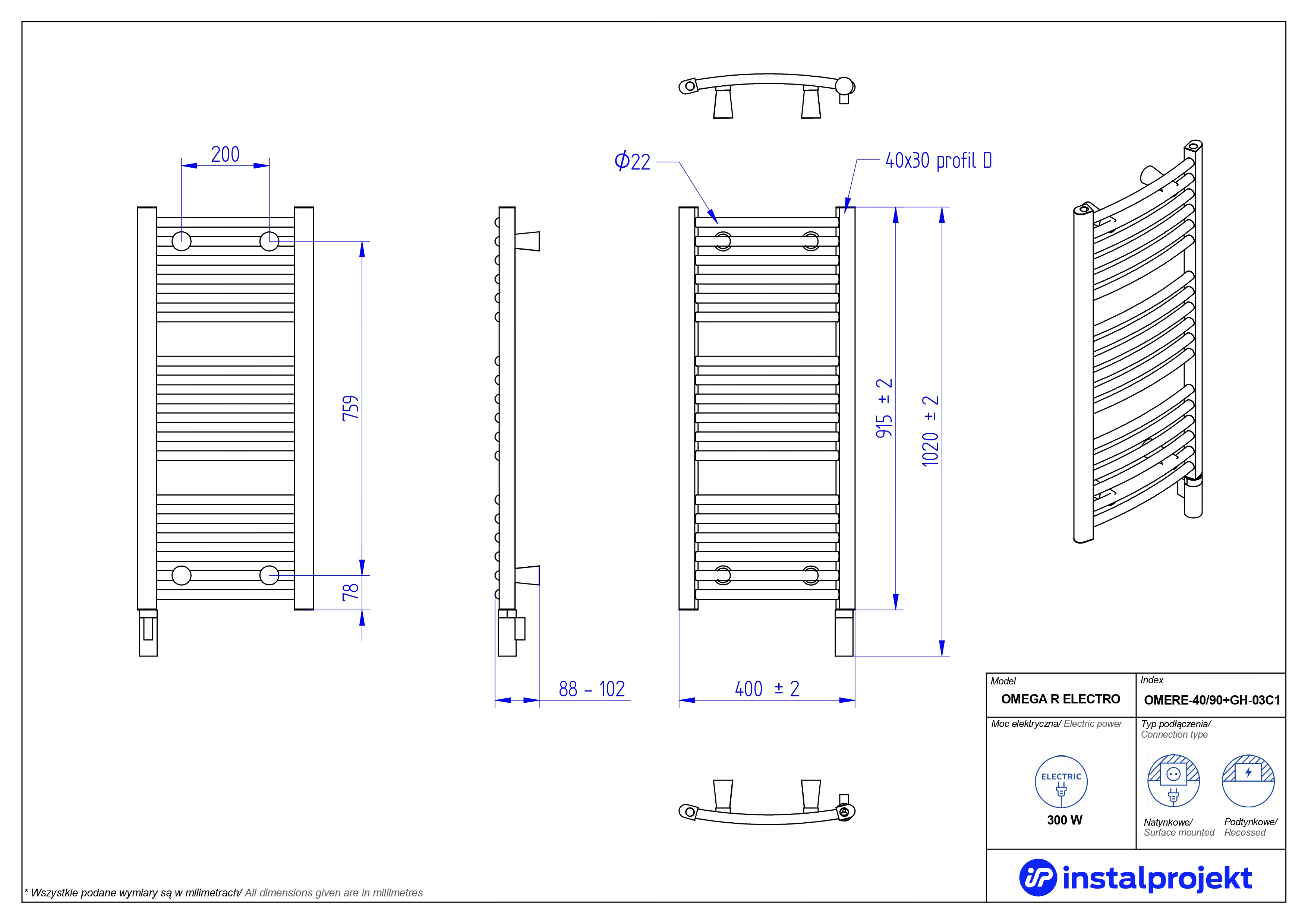 Grzejnik elektryczny (suszarka) INSTAL-PROJEKT OMEGA R ELECTRO, wym. 915 (1020 z grzałką)/400 mm, kolor biały połysk, moc 300 W
