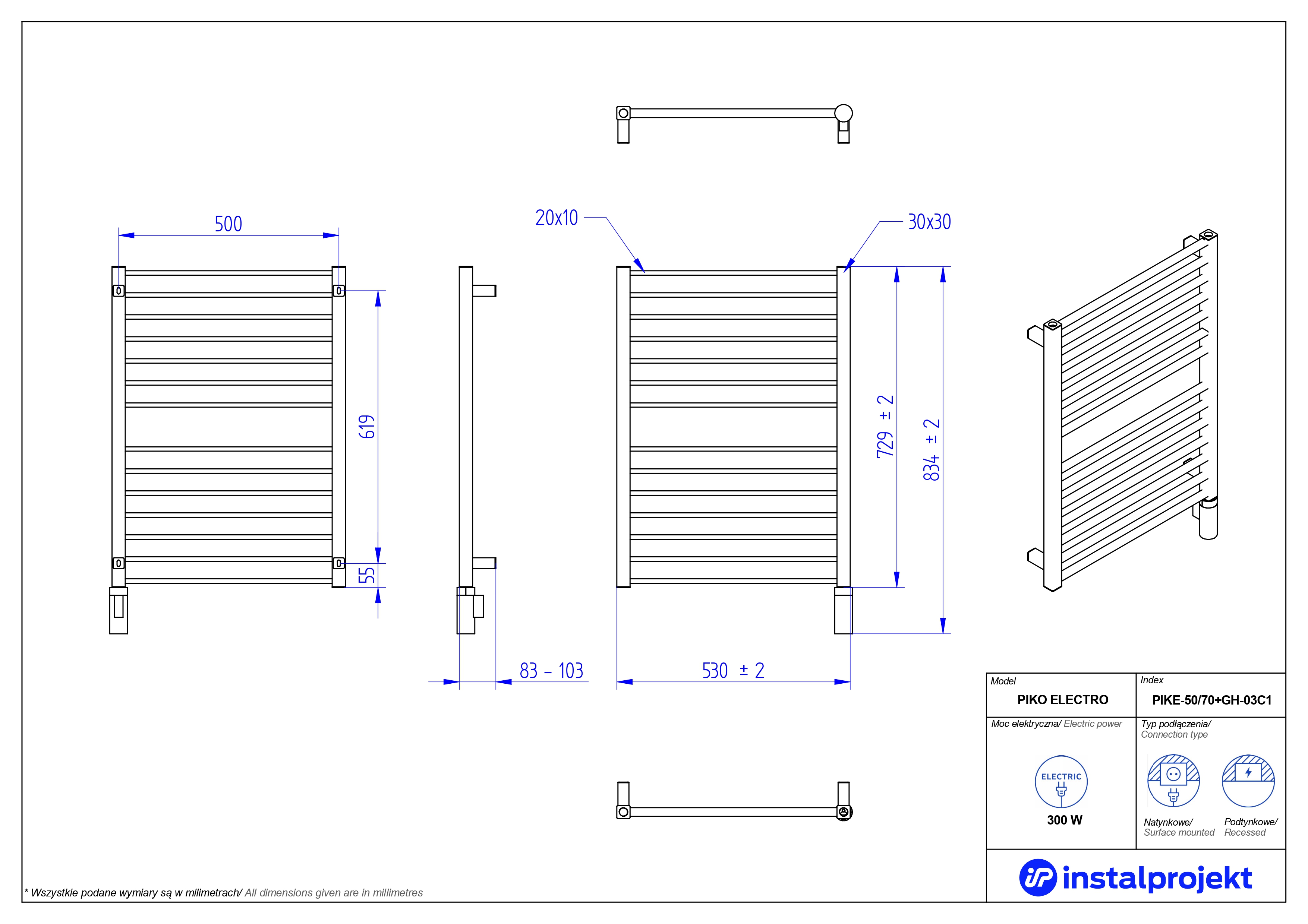 Grzejnik elektryczny (suszarka) INSTAL-PROJEKT PIKO ELECTRO, wym. 729 (834 z grzałką)/530 mm, kolor biały mat, moc 300 W