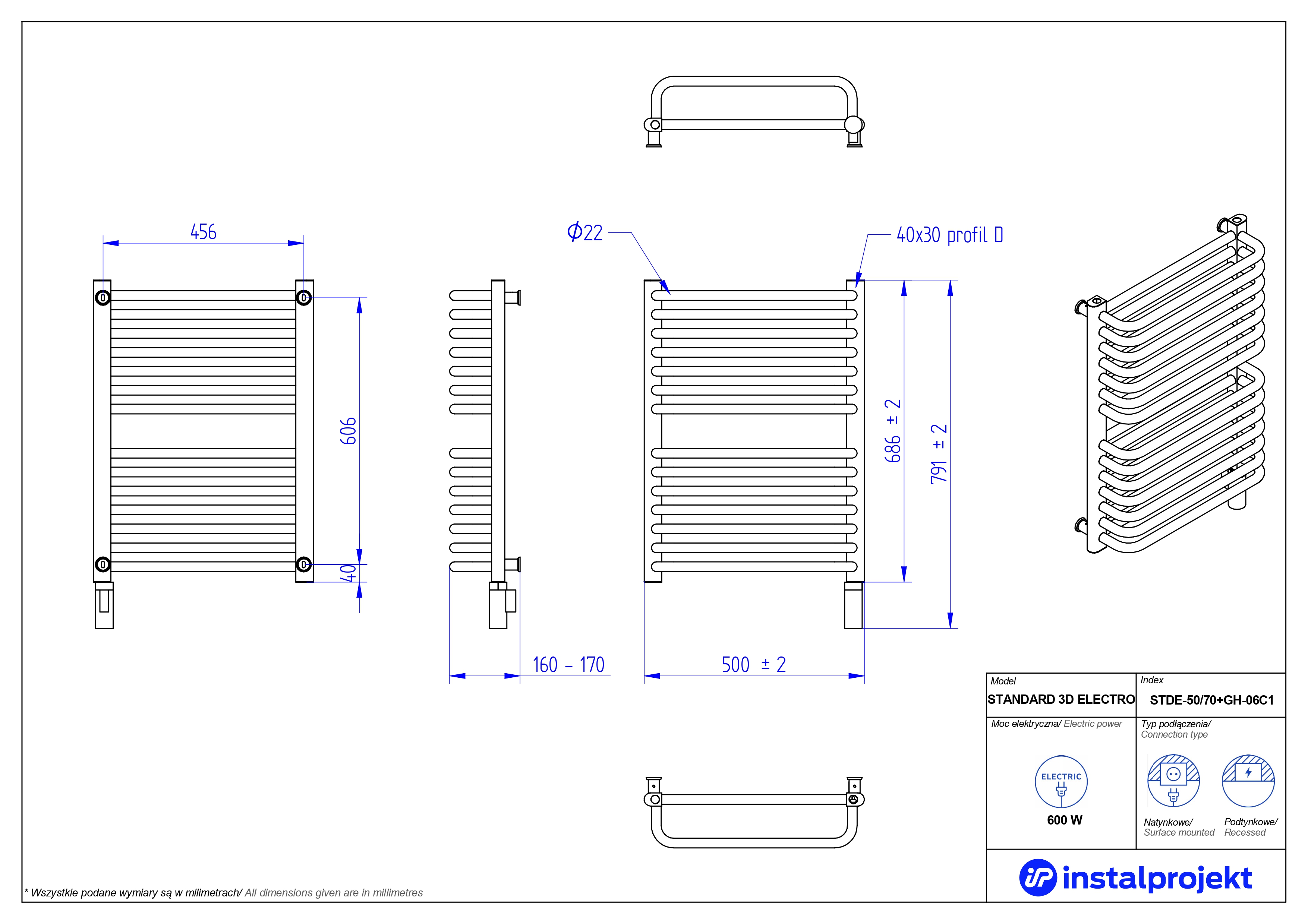 Grzejnik elektryczny (suszarka) INSTAL-PROJEKT STANDARD 3D ELECTRO, wym. 686 (791 z grzałką)/500 mm, kolor biały połysk, moc 600 W
