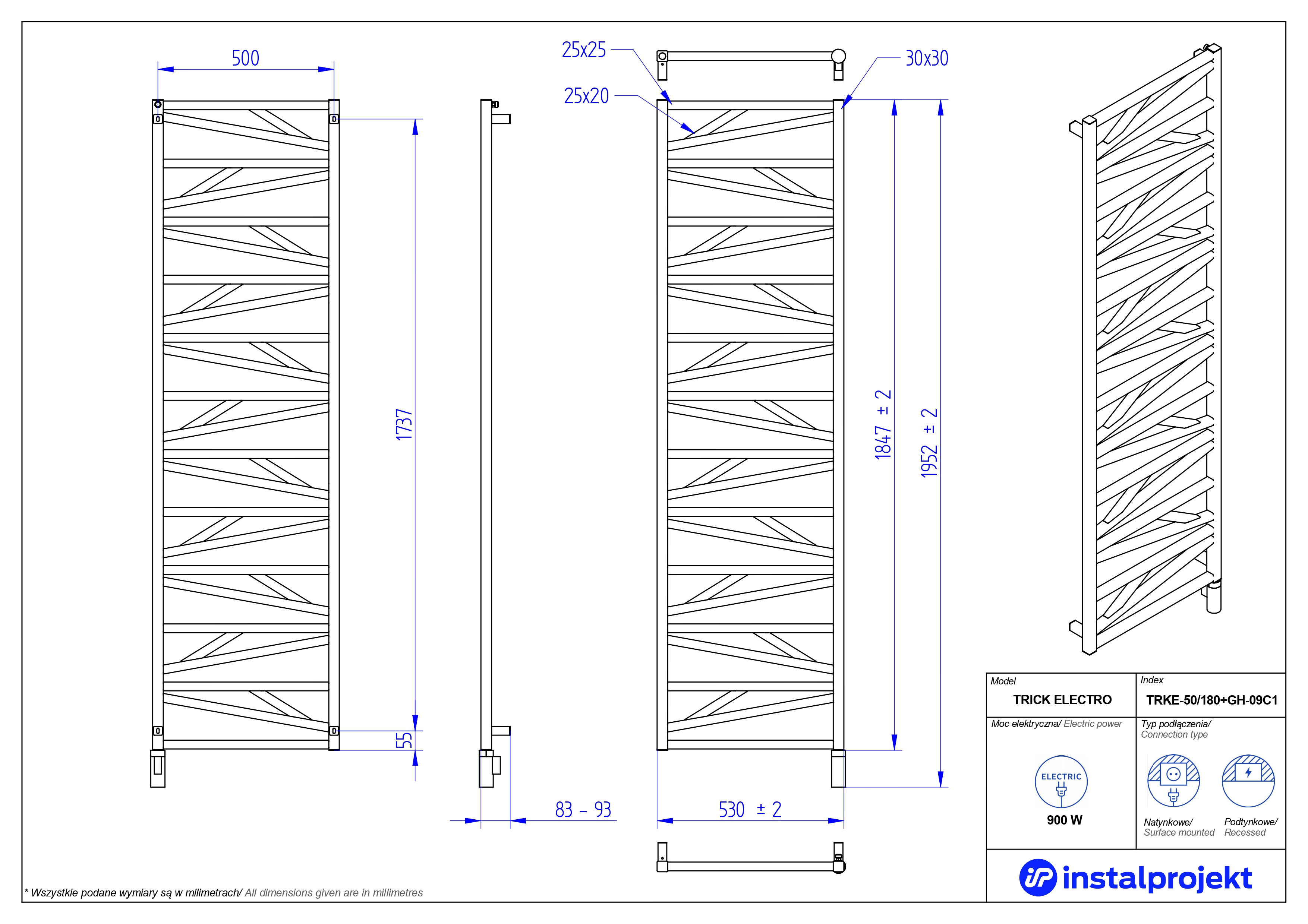 Grzejnik elektryczny (suszarka) INSTAL-PROJEKT TRICK ELECTRO, wym. 1847 (1952 z grzałką)/530 mm, kolor czarny, moc 900 W