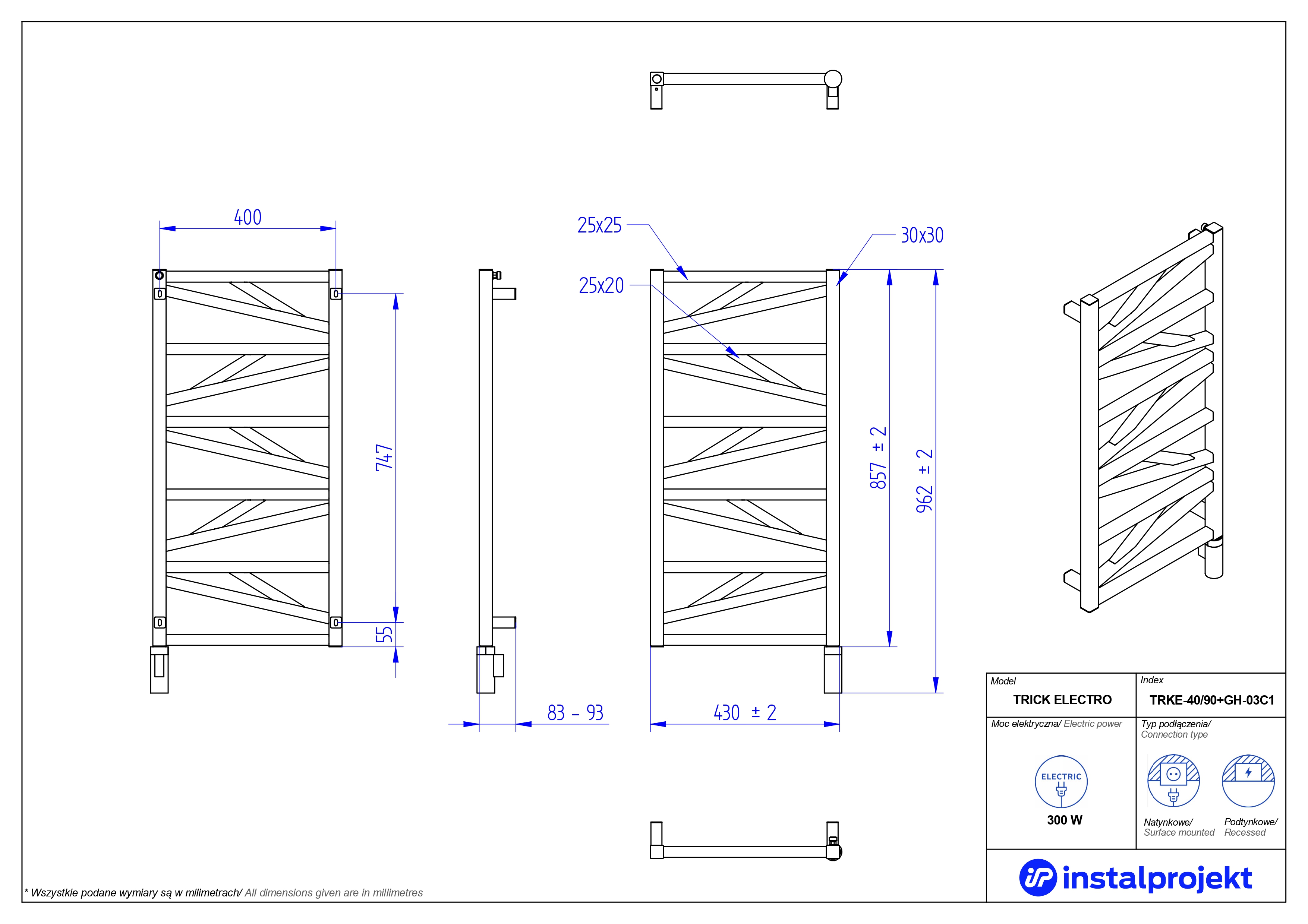 Grzejnik elektryczny (suszarka) INSTAL-PROJEKT TRICK ELECTRO, wym. 857 (962 z grzałką)/430 mm, kolor biały mat, moc 300 W
