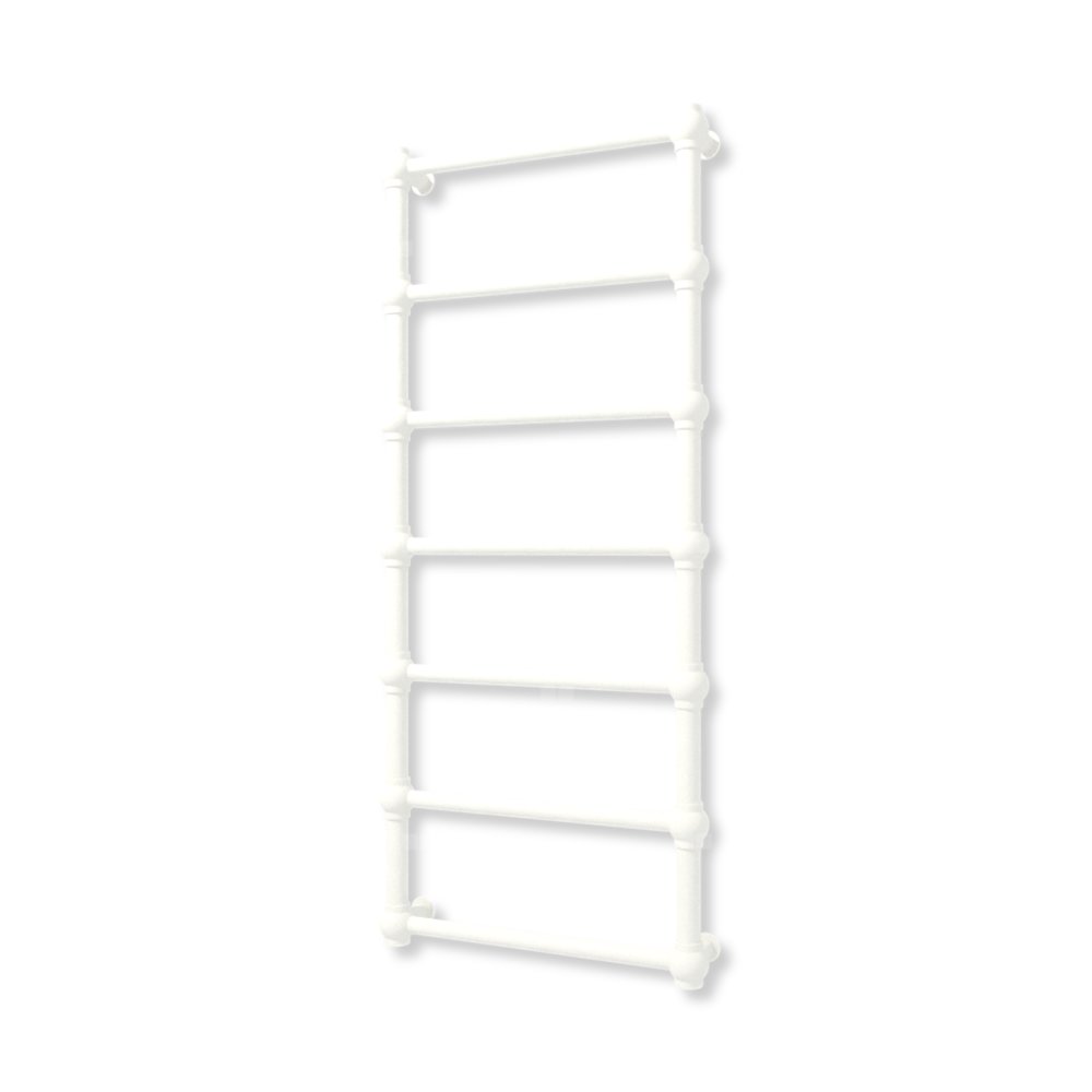 Bryła grzejnika została skonstuowana z rur o przekroju koła oraz stalowych kul. Całość tworzy formę charakterystyczną dla stylu retro.