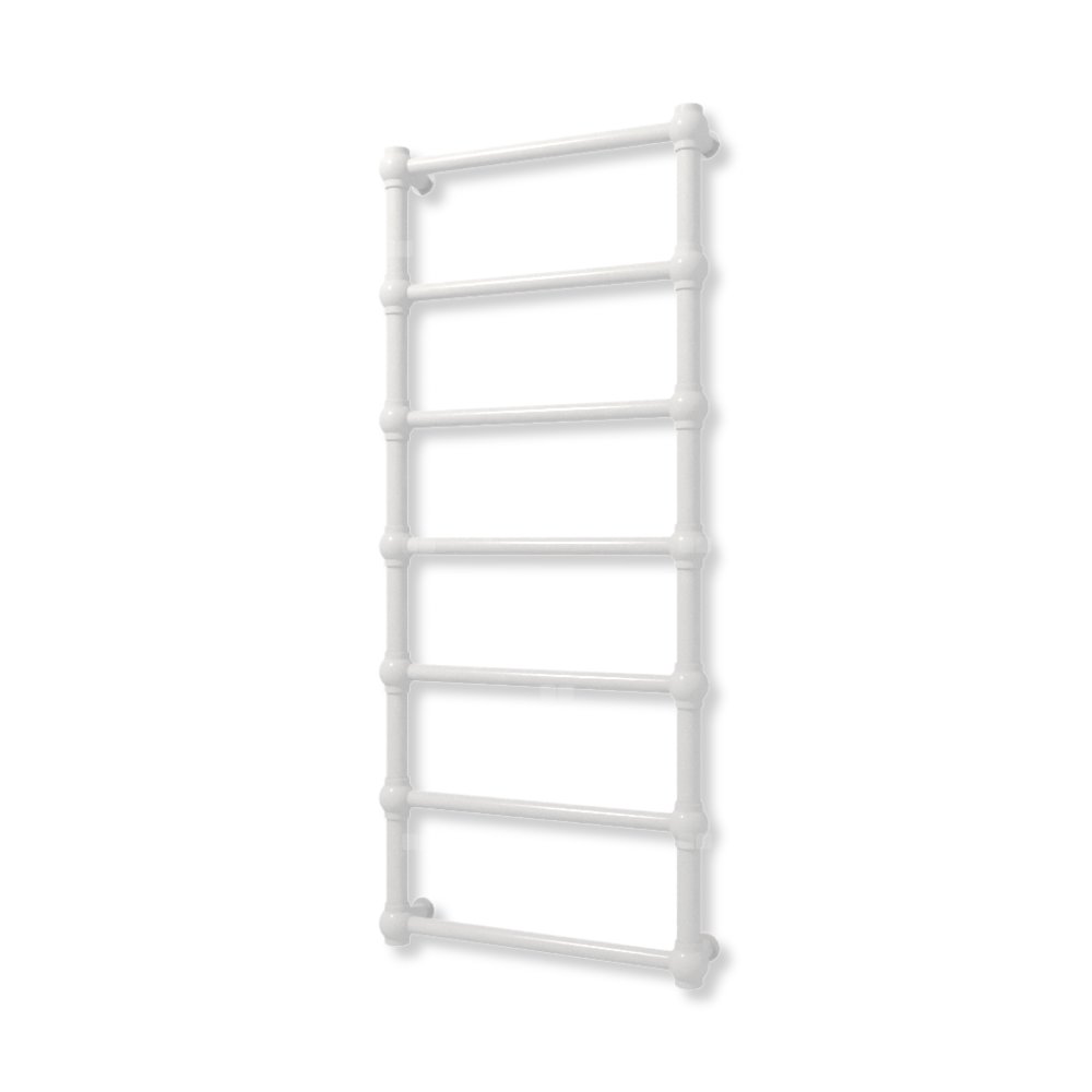 Bryła grzejnika została skonstuowana z rur o przekroju koła oraz stalowych kul. Całość tworzy formę charakterystyczną dla stylu retro.