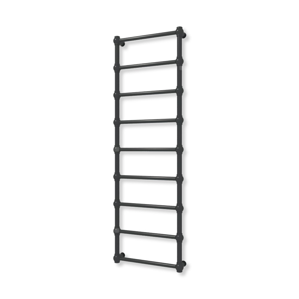 Bryła grzejnika została skonstuowana z rur o przekroju koła oraz stalowych kul. Całość tworzy formę charakterystyczną dla stylu retro.