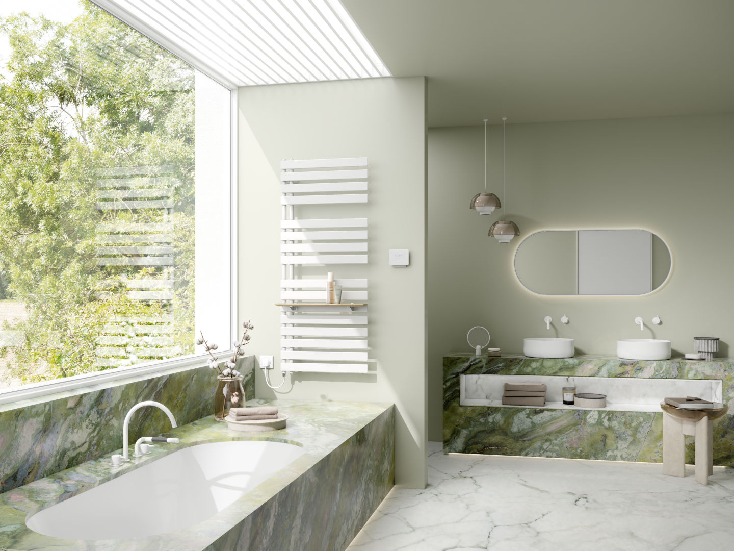 Asymetryczna forma i  rozmieszczenie płaskich prętów grzewczych w  blokach to cechy charakterystyczne Credo Half. Grzejnik jest z  jednej strony otwarty, co pozwala wygodnie zawieszać ręczniki. Grzejniki są dostępne w  wersjach prawej i  lewej. Opcjonalna półka z  drewna naturalnego stanowi elegancki, a  jednocześnie praktyczny akcent. Ciepła estetyka drewna w  ciekawy sposób kontrastuje ze stalowymi elementami grzejnika i  dodaje łazience przytulności.