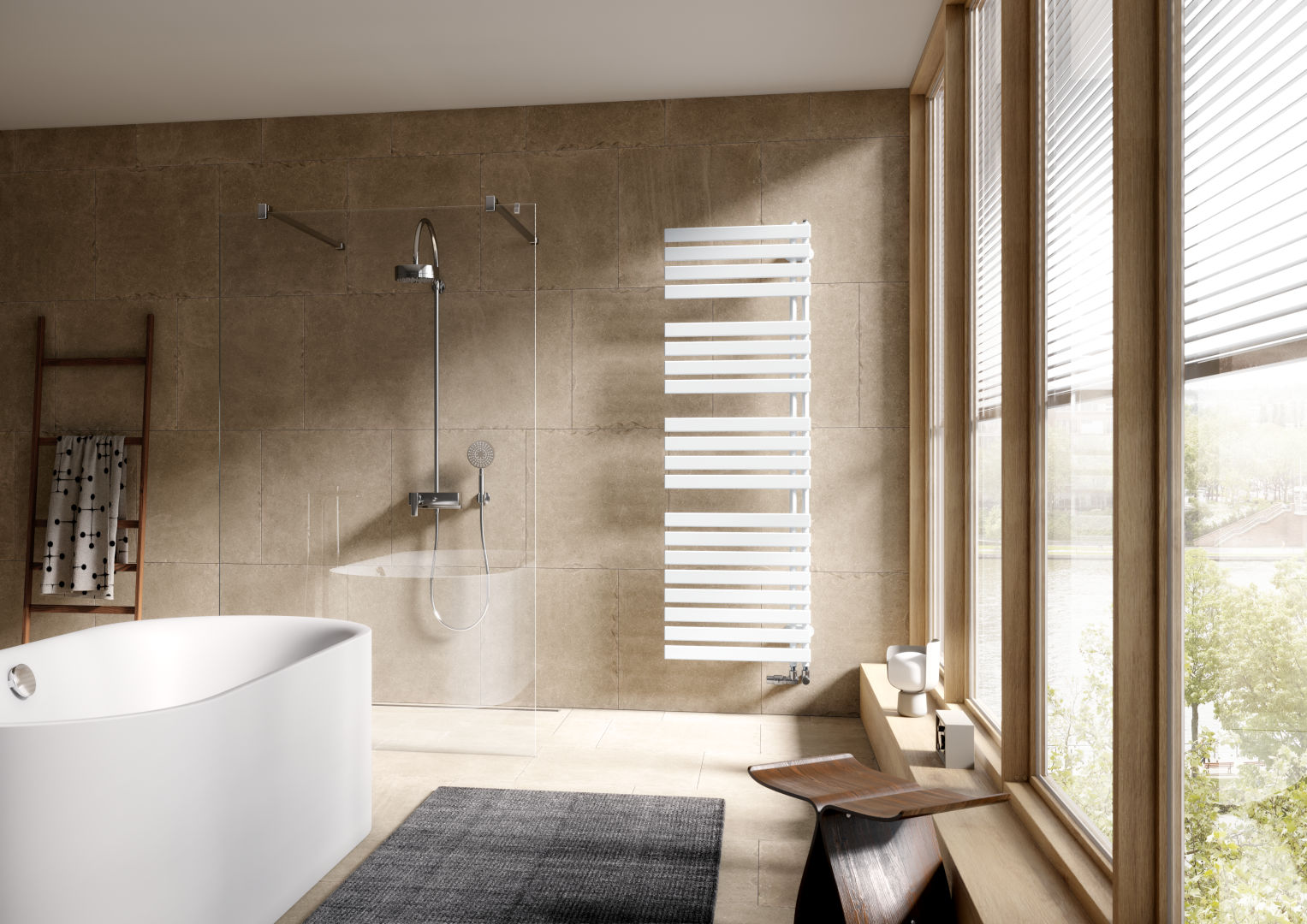 Asymetryczna forma i  rozmieszczenie płaskich prętów grzewczych w  blokach to cechy charakterystyczne Credo Half. Grzejnik jest z  jednej strony otwarty, co pozwala wygodnie zawieszać ręczniki. Grzejniki są dostępne w  wersjach prawej i  lewej. Opcjonalna półka z  drewna naturalnego stanowi elegancki, a  jednocześnie praktyczny akcent. Ciepła estetyka drewna w  ciekawy sposób kontrastuje ze stalowymi elementami grzejnika i  dodaje łazience przytulności.