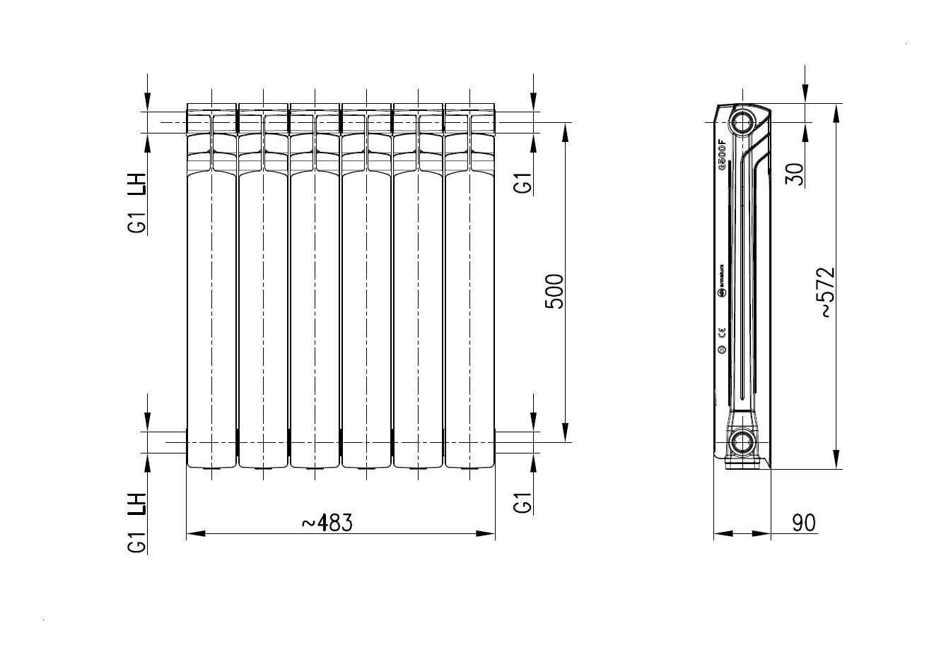 Grzejnik żeberkowy KFA Armatura G500F/6 aluminium, podłączenie boczne 572 x 483 mm, kolor biały (RAL 9010)