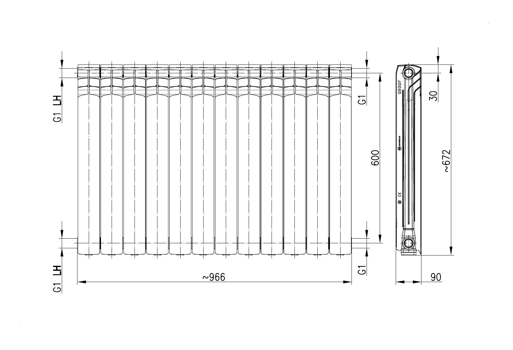 Grzejnik żeberkowy KFA Armatura G600F/12 aluminium, podłączenie boczne 672 x 966 mm, kolor biały