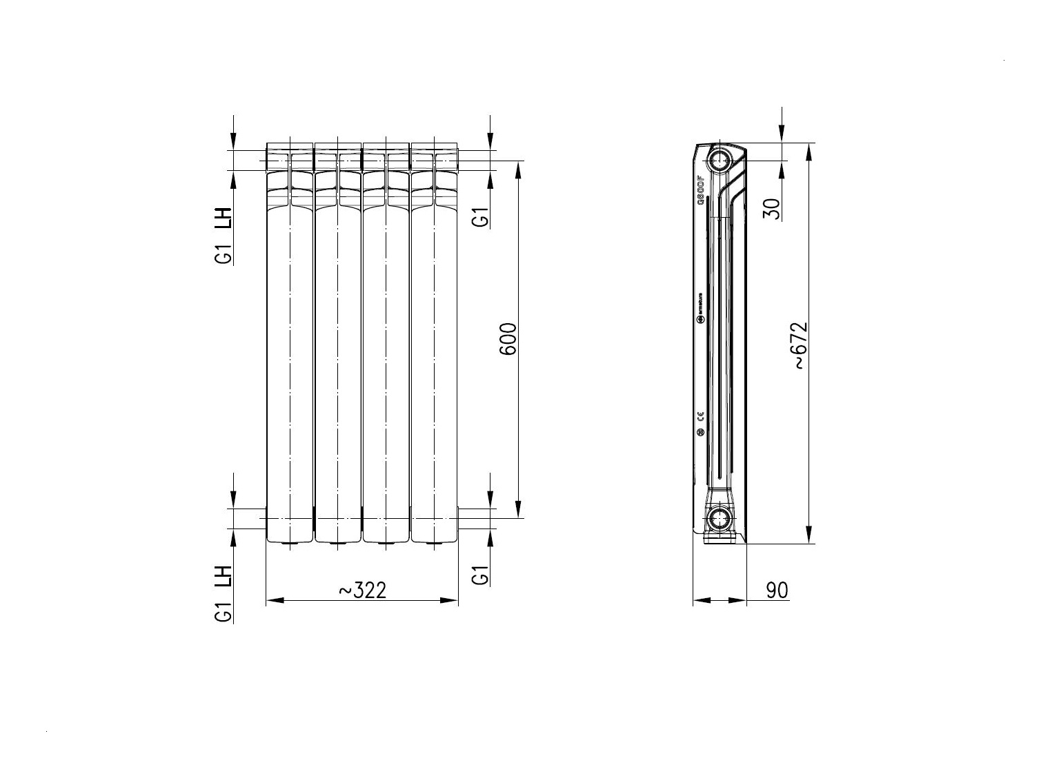 Grzejnik żeberkowy KFA Armatura G600F/4 aluminium, podłączenie boczne 672 x 322 mm, kolor grafit