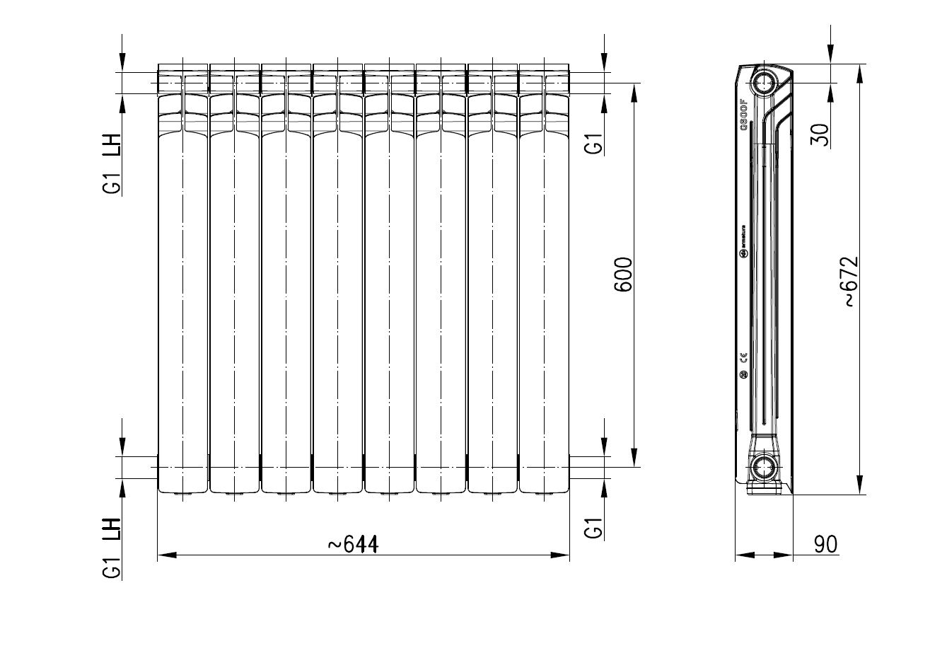 Grzejnik żeberkowy KFA Armatura G600F/8 aluminium, podłączenie boczne 672 x 644 mm, kolor czarny