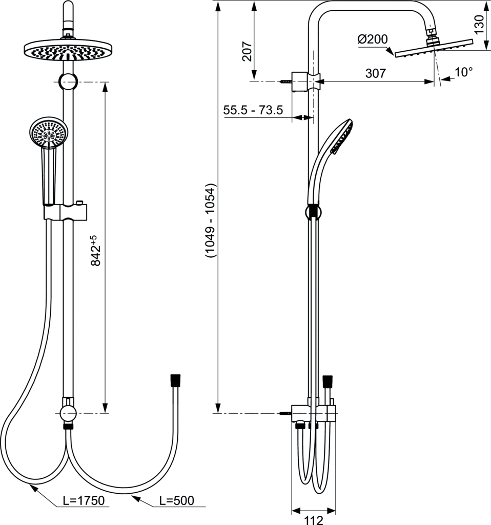 System natryskowy bez mocowania. Dwudrożny, zintegrowany ceramiczny przełącznik: słuchawka/deszczownica. Regulowany, solidny uchwyt ścienny, 2ygięte ramię mocowane do uchwytu ściennego. Trzyfunkcyjna słuchawka prysznicowa z tworzywa: 80 mm, z ogranicznikiem przepływu wody do 8 l/min. Deszczownica z tworzywa: 200mm, z ogranicznikiem przepływu wody do 9,5 l/min. Drążek przepływowy, 1051 mm, Ø 25 mm z uchwytem. IdealFlex 1750 mm gładki wąż natryskowy z zabezpieczeniem przeciwskrętnym, 0,5 m (do podłączenia systemu).