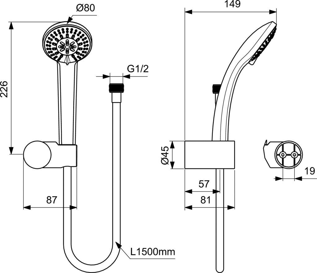 Idealrain zestaw natryskowy S drążek 600 mm. Trójfunkcyjna słuchawka prysznicowa średnicy 80 mm i ogranicznikiem przepływu wody do 8 l/min. Drążek o długości 600 mm z przeźroczystą mydelniczką. Metalowy wąż długości 1500 mm. Wykonane z tworzywa mocowanie przesuwne słuchawki.