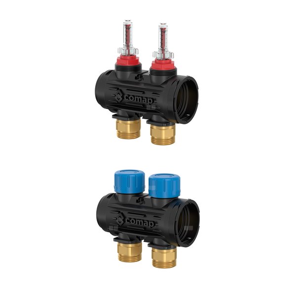 Rozdzielacz stalowy F-Comfort z zaworami termostatycznymi, przepływomierzami, ręcznym odpowietrznikiem i zaworem spustowym, 2-drogowy