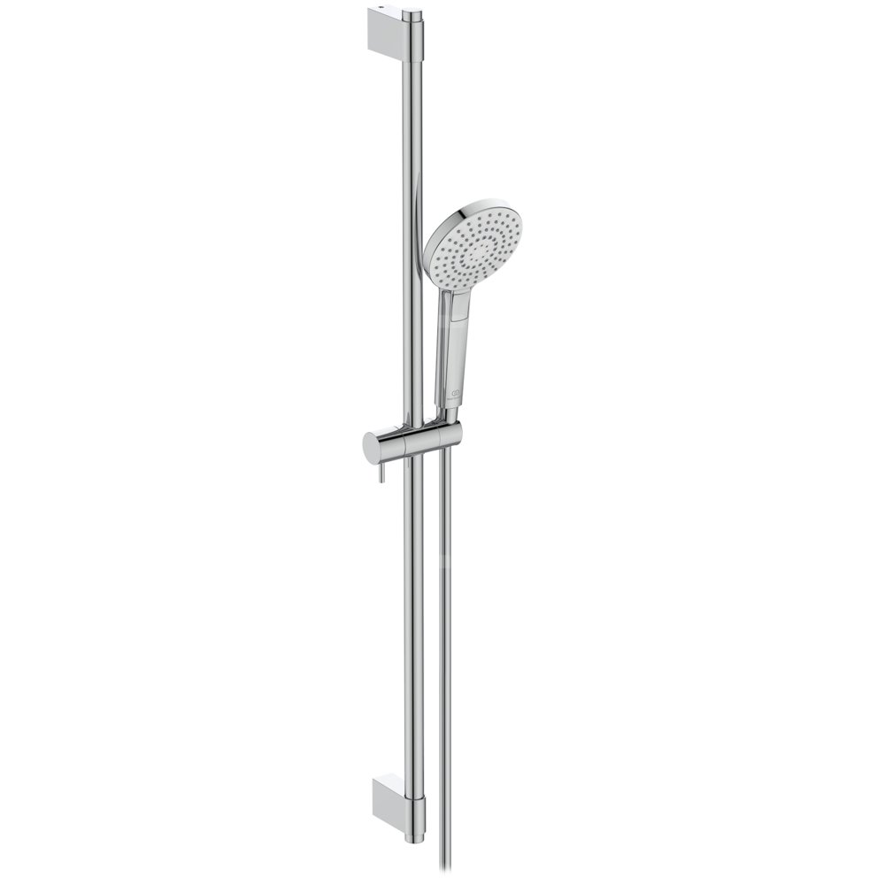 Metalowy drążek prysznicowy długości 900 mm. Regulowane metalowe mocowanie słuchawki. Wąż Idealflex 1750 mm z tworzywa odpornego na osad kamienia. Trzyfunkcyjna słuchawka średnicy Ø 110 mm. Rodzaje strumienia wody: deszcz, deszcz napowietrzony, masaż. Wybór strumienia wygodnym przyciskiem Navigo. Gumowe końcówki dysz zapobiegające osadzaniu się kamienia. Ogranicznik przepływu wody do 8 l/min. Minimalne ciśnienie wody 0,1 bar.