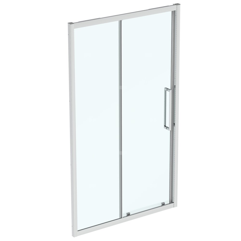 Drzwi przesuwne prysznicowe z panelem bocznym. Wykonane z bezpiecznego transparentnego szkła 8 mm z powłoką Ideal Clean zabezpieczającą przed osadzaniem się kamienia. Profile aluminiowe o grubości 1,2 mm. Rozciągliwość 20 mm na profil. Zastosowanie systemu podwójnych kółek na górze z systemem szybkiego zamykania na dole. Przeznaczony do montażu we wnęce (ściana do ściany) lub w narożniku (z panelem bocznym typu L). Do montażu z brodzikami Ideal Standard lub bezpośrednio na płytkach. Wszystkie produkty z linii są odwracalne. Więcej informacji oraz rekomendowanych rozwiązań znajduje się w katalogu lub cenniku.