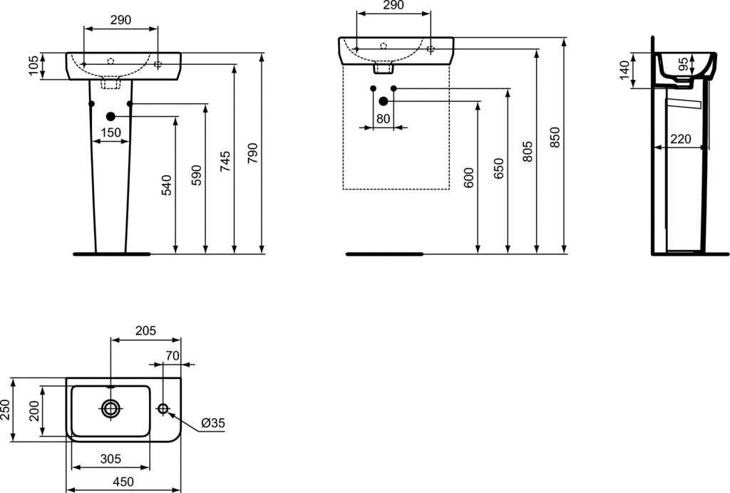 Umywalka do mycia rąk Ideal Standard i.life S 45 cm z wybitym otworem na baterię po prawej stronie oraz przelewem. Zestaw montażowy TT0299729 w komplecie. Do montażu z małym postumentem E253901 lub samodzielnie z syfonem.