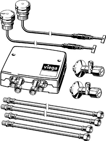 Multiplex Trio E2-armatura, elektroniczna jednostka mieszająca. Przeznaczenie: napełnienie wanny (za pomocą elektronicznego sterowania), w połączeniu z Multiplex Trio, Multiplex Trio F, Rotaplex Trio lub Rotaplex Trio F (napęd elektryczny), z możliwością dodatkowego domówienia: Multiplex Trio E-moduł WLAN nr wzoru 6146.224, elektryczne otwieranie/zamykanie kompletu odpływowego Viega, zdalnie sterowany za pomocą urządzeń mobilnych (Android, iOS, Windows) przy połączeniu bezpośrednim lub przez Internet z modułem E-WLAN Multiplex Trio. Wyposażenie: 2 chromowane jednostki regulujące, funkcja zapamiętywania temperatury, ilości dopływu wody oraz napełnienia, 3 indywidualne ustawienia wstępne użytkownika, dopływ wannowy – ręczne przestawianie funkcji baterii wannowej i słuchawki prysznicowej, możliwość ręcznego zwolnienia blokady powyżej 38°C, węże przyłączeniowe elastyczne, zawory kątowe, zasilacz. Dane techniczne: napięcie zasilania 100–240 V AC/50–60 Hz, wg PN-EN 1111, nr wzoru 6146.2, nr kat. 682 972,