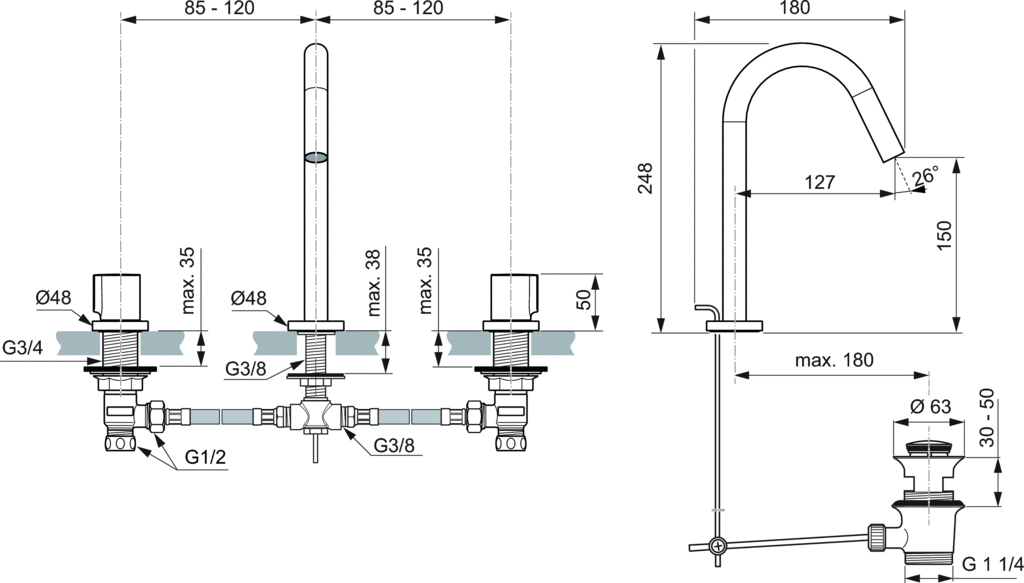 Głowica ceramiczna 28 mm z ogranicznikiem temperatury wody. Logo Ideal Standard umieszczone na korpusie wylewki. Metalowy uchwyt bez oznaczenia wody ciepłej i zimnej. Aerator typu Caché M16,5x1 z ogranicznikiem przepływu wody do 5 l/min. System montażu EASY-FIX. Wężyki przyłączeniowe G3/8". Metalowy korek automatyczny.