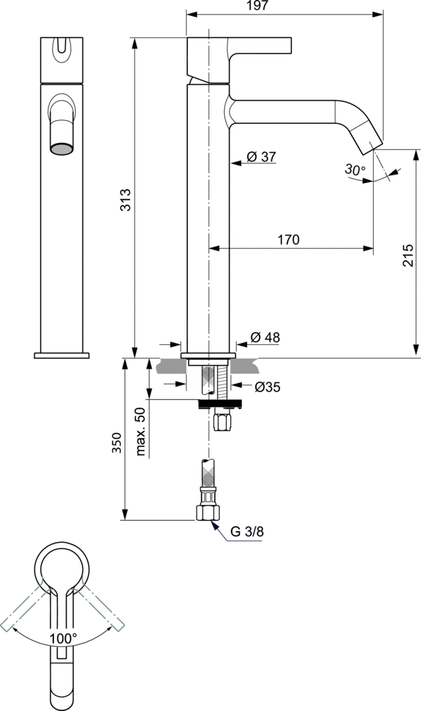 Głowica ceramiczna 28 mm z ogranicznikiem temperatury wody. Logo Ideal Standard umieszczone na korpusie baterii. Metalowy uchwyt bez oznaczenia wody ciepłej i zimnej. Aerator typu Caché M16,5x1 z ogranicznikiem przepływu wody do 5 l/min. System montażu EASY-FIX. Wężyki przyłączeniowe G3/8".