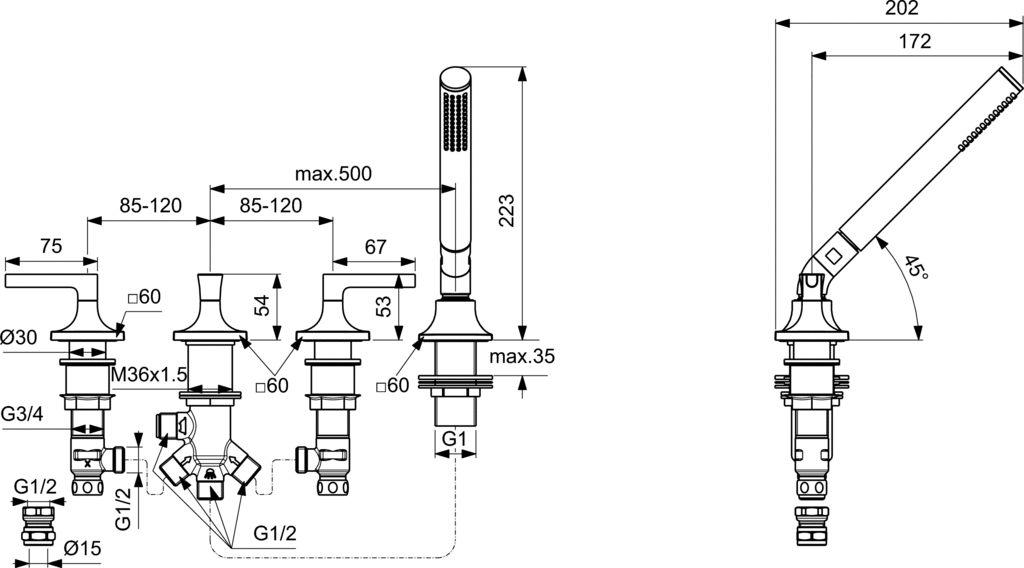 Bateria natryskowo-wannowa 4-otworowa, uchwyty dźwigniowe.