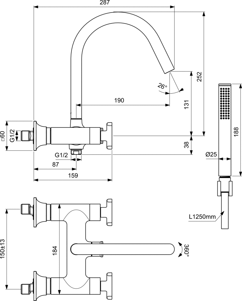 Bateria natryskowo-wannowa, Dual Control, uchwyty krzyżowe.