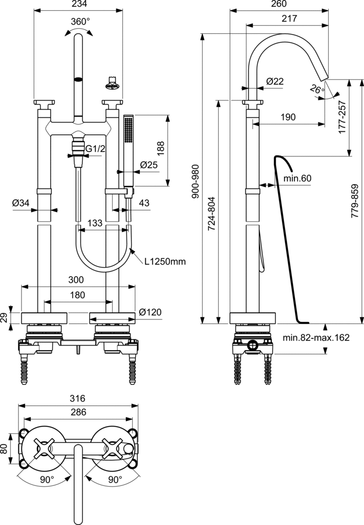 Bateria natryskowo-wannowa wolnostojąca, uchwyty krzyżowe.