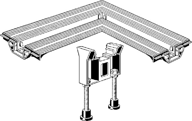 Advantix Vario-łącznik, 90°. Przeznaczenie: połączenie dwóch odpływów liniowych. Zastosowanie: Advantix Vario-odpływ liniowy nr wzoru 4965.20, Advantix Vario-odpływ liniowy - korpus nr wzoru 4965.10, tworzywo sztuczne wysokiej jakości. Wyposażenie: Regulowana nóżka, element dystansowy, taśma uszczelniająca. Wyposażenie montażowe, nr wzoru 4965.14, nr kat. 708 924, L1: 290 L2: 290 B: 110