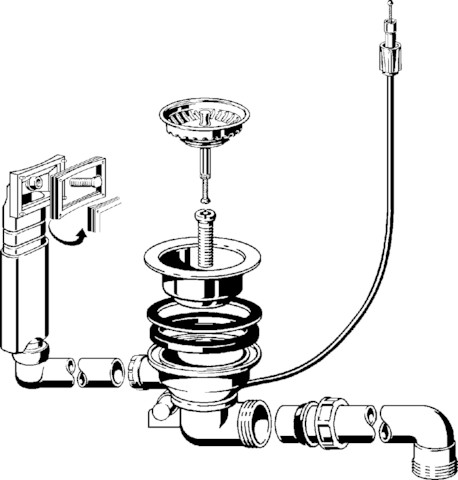 Komplet odpływowo-przelewowy. Wyposażenie: Mechanika cięgna Bowdena, przelew, uszczelka do przelewu (nadaje się do gładkich i wyprofilowanych ścian zlewozmywaków), wyjmowany koszyczek ze stali nierdzewnej, łuk odpływowy 90°, górna część zaworu ze stali nierdzewnej, nr wzoru 7139.161, nr kat. 678 562, G: 1½ Ø: 114,5 do zlewozmywaków z otworem odpływowym Ø 90,