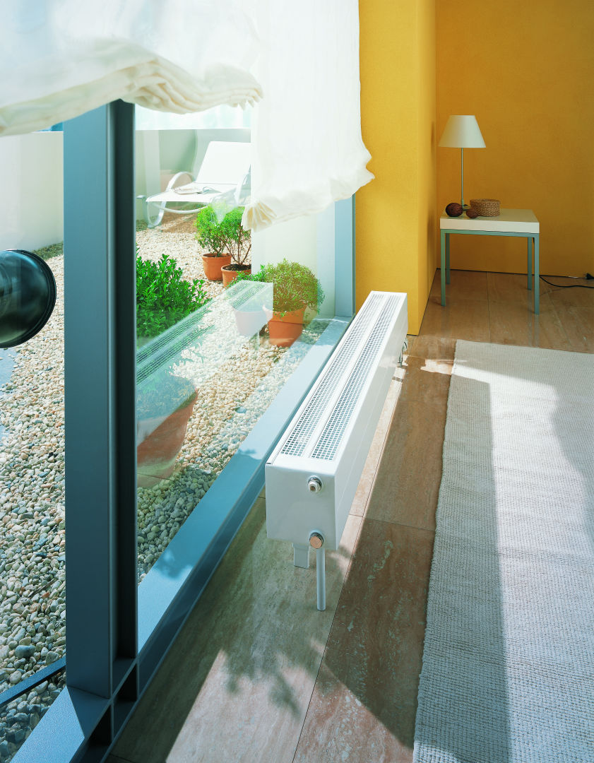 Minimalistyczny konwektor – skuteczny sposób na zredukowanie strat ciepła spowodowanych dużymi przeszkleniami.