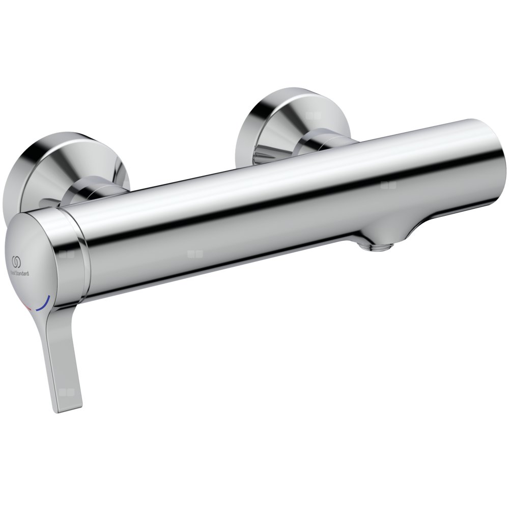Bateria natryskowa ścienna Melange z systemem przyłączy bez widocznych nakrętek. Jednopoziomowa głowica 40 mm IS Multiport z HWTC. Odlewany korpus. Czerwone i niebieskie oznaczenie na uchwycie, zawór zwrotny.