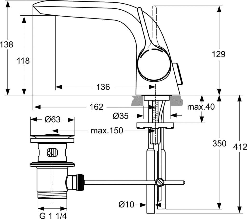Mocowanie EASY-FIX. Rury Cu D10 do podłączenia instalacji wodnej. Głowica 35 mm z ogranicznikiem przepływu gorącej wody. Odlewany korpus z otworem na wysuwane cięgno. Metalowy automatyczny korek. Ukryty aerator typu Cache M21,5x1. Zgodność z normą EN817.