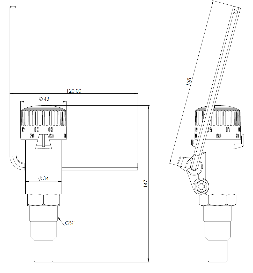 Zbudowany z termostatu zabudowanego w mosiężnej tulei, pokrętła i metalowego ramienia z łańcuchem.