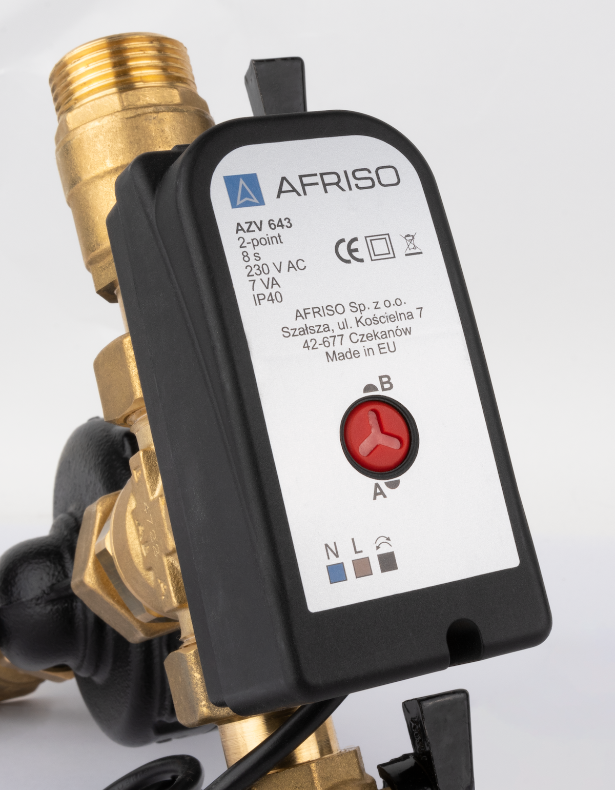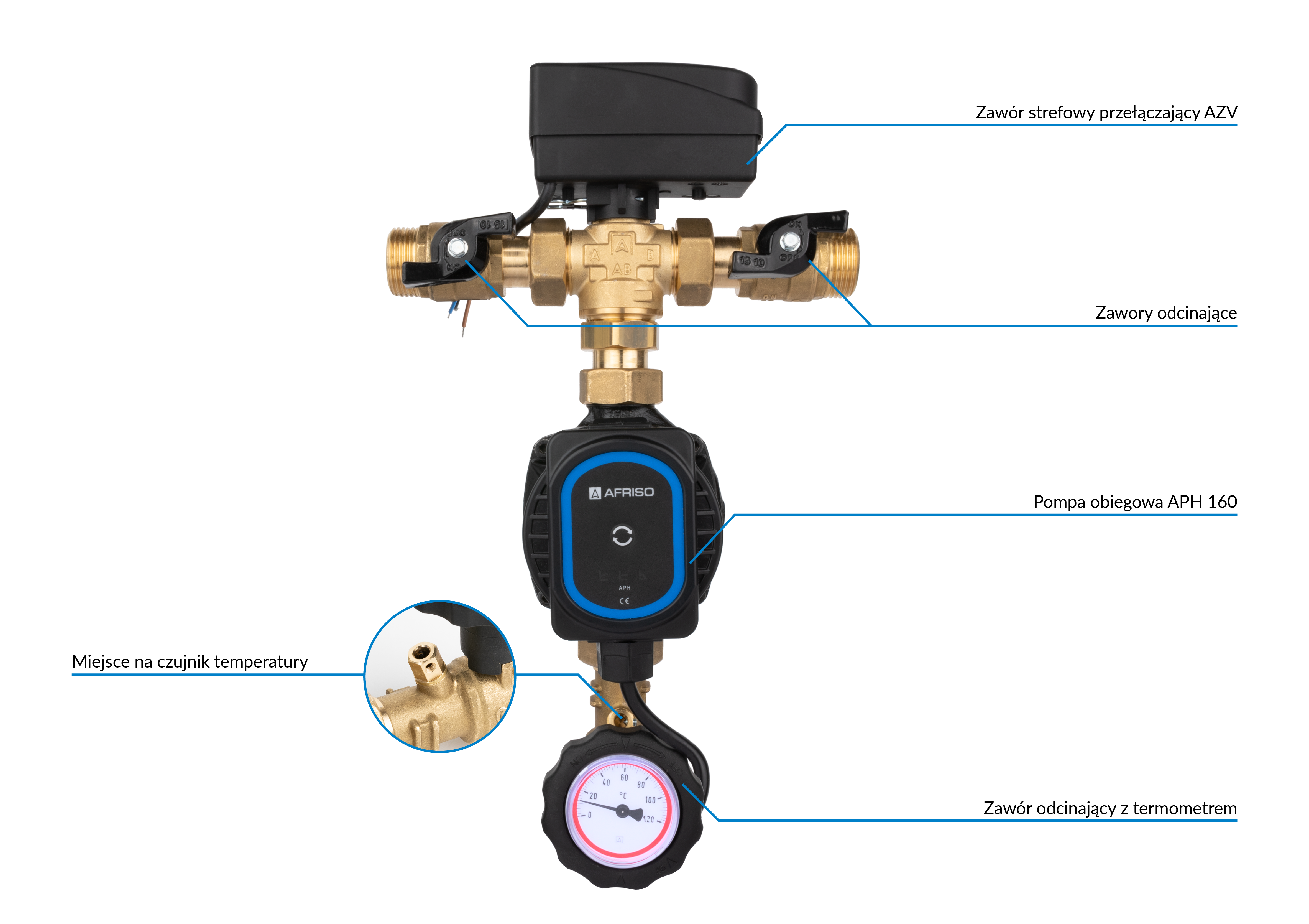 Wyposażony w 3-drogowy zawór strefowy AZV 643 oraz pompę obiegową APH 160.