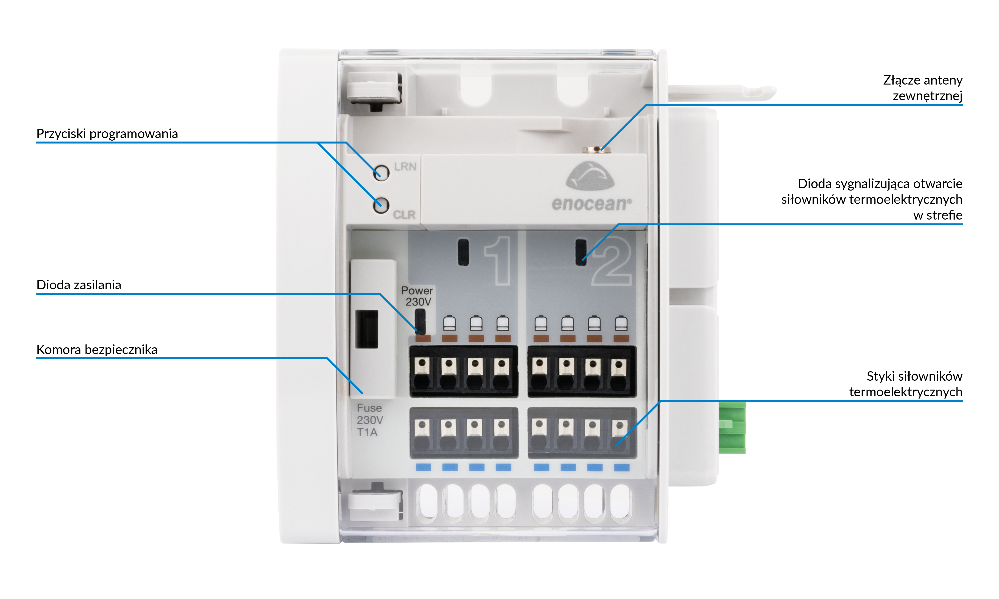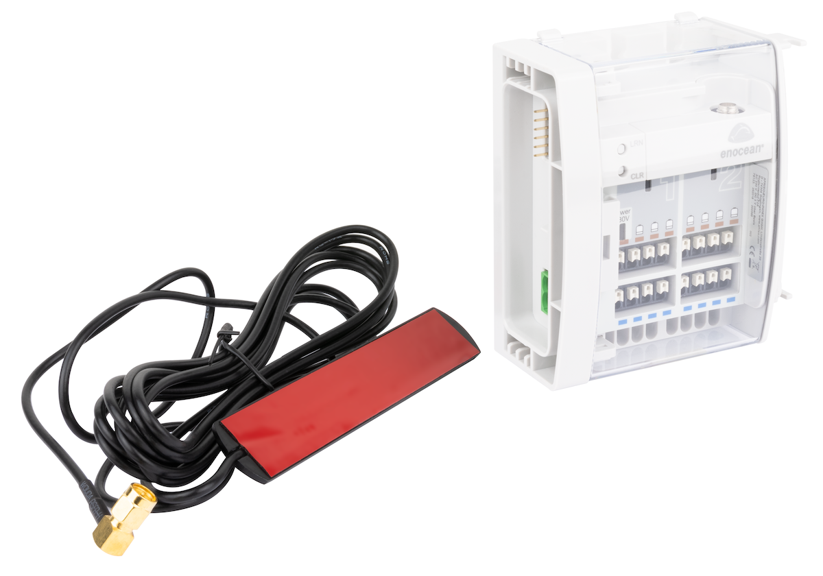 Antena zewnętrzna wyprowadza odbiornik sygnału EnOcean poza szafkę rozdzielacza, poprawiając zasięg.