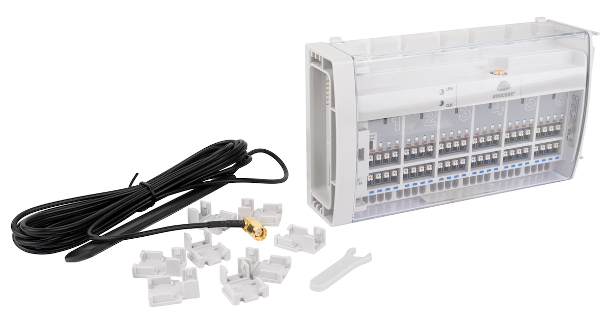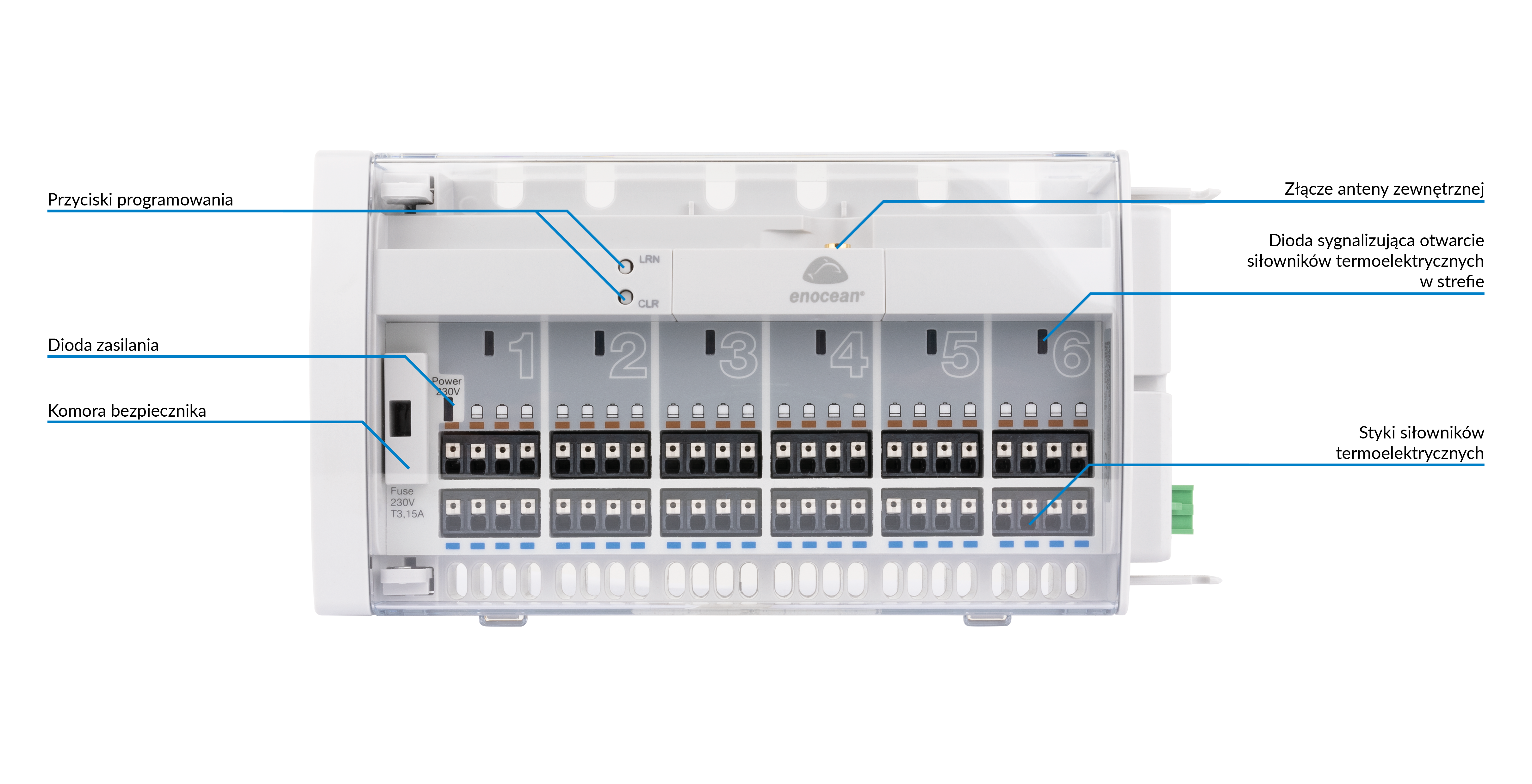 Antena zewnętrzna wyprowadza odbiornik sygnału EnOcean poza szafkę rozdzielacza, poprawiając zasięg.