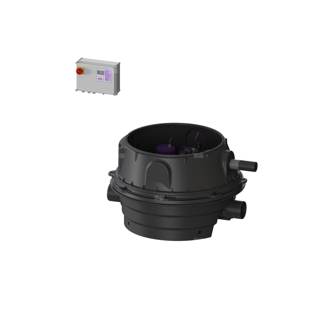 KESSEL Przepompownia przeciw. Ecolift XL, ścieków Ścieki bez fekaliów, zabudowa w ziemi, urządzenie dwupompowe, z 2 SPF 3000 pomp zatapialnych, typ pracy S1, czujnik alarmu z Sonda optyczna, sterownik Comfort Plus, Wariant z najniższą zabudową